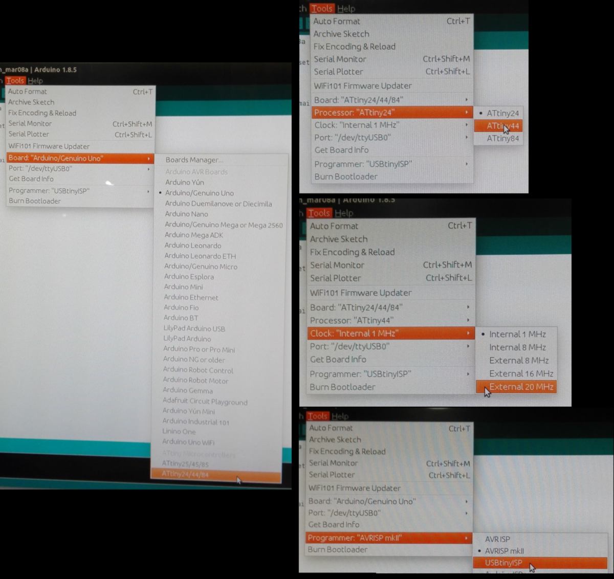 I then specify the type of board (the Attiny24/44/84 is now available in the list), specific microprocessor, clock and finally programer used :
