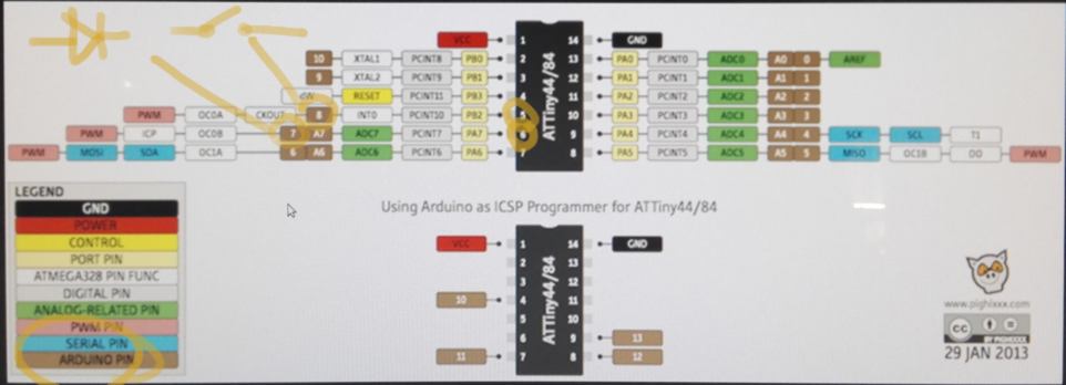 The Attiny44 and the arduino board have corresponding pin schematic. Here, my slideswitch and LED are located on pin 5 and 6 of my attiny44 respectively. In the arduino IDE, I will use their corresponding pin number, 8 and 7 respectively :