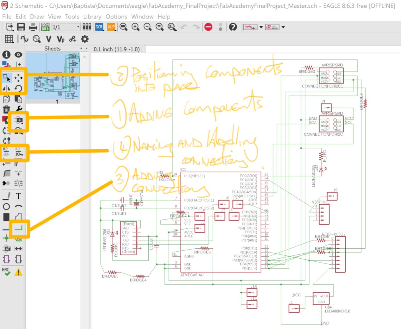 It all begins at schematic level, where I select each component from the fab library downloaded from our lesson. I follow this tutorial ot import the new library. Rather than connecting them visually, which will result in a messy web of tangled lines, I label them appropriately to make connections :