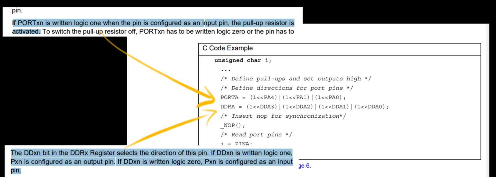 Each pin can be configured using three registers bits :DDxn, PORTxn, and PINxn, accessed using specific addresses :