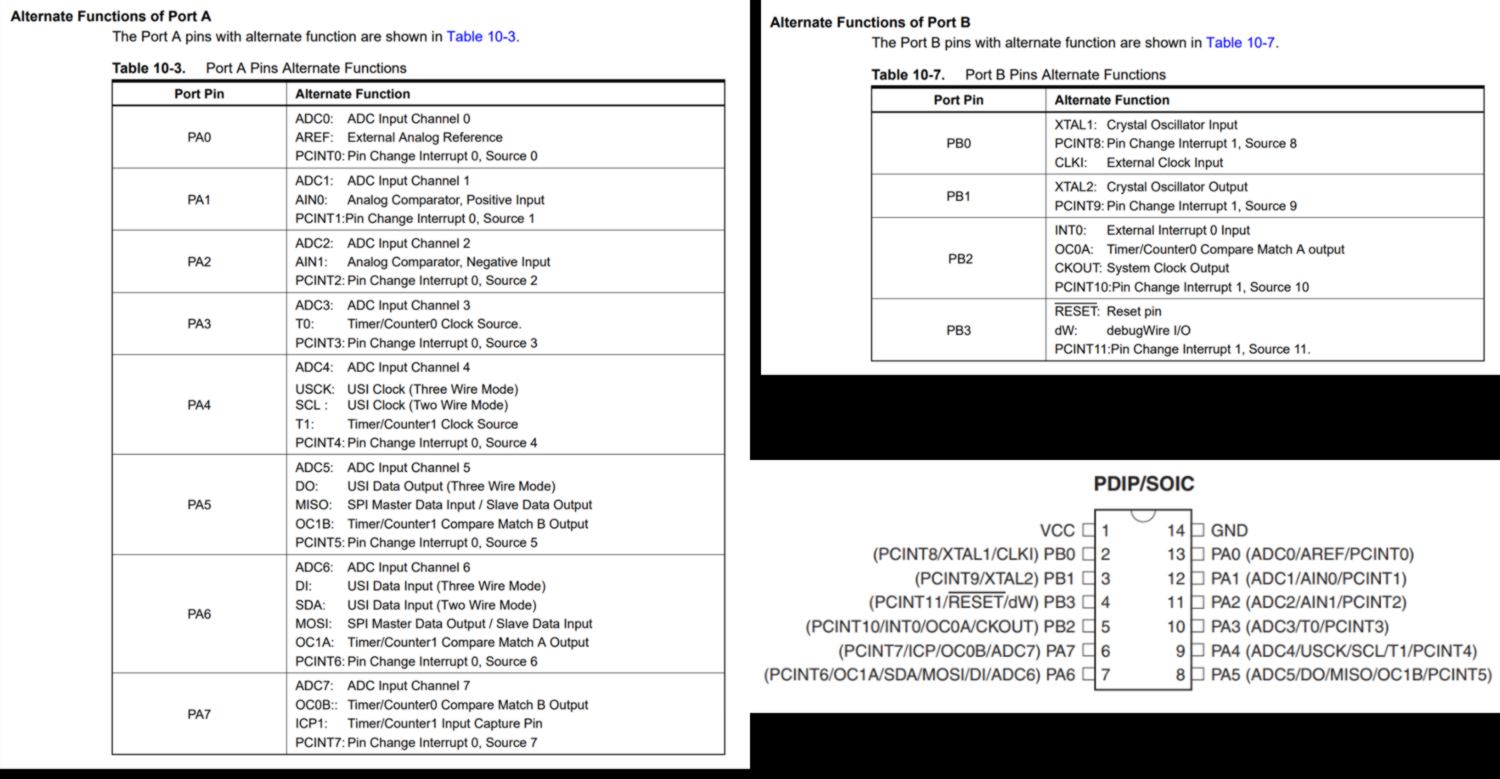 I briefly skim through 8-bit and 16-bits Timer/Counter with PWM, allowing more or less accurate program execution timing, wave generation, and signal timing measurement. I notice that PA3 to 7 and PB2 can interact with this Timer/Counter system.