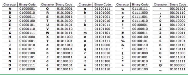 Out of curiosity I look for the way letters are written in binary. After all that is what switches are able to perform, and apparently the 8-bits systems was chosen ( rather than 5 of 9, true story?) since all letters of the latin alphabets and common punctuation signs fitted in: