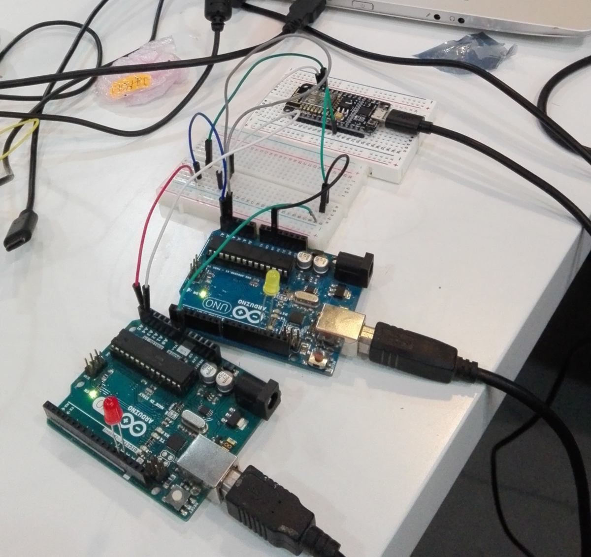 I then attempt to connect all my microcontrollers together, but when switching the USB on on my computer, the lights slowly switches off. Since I also use the arduino as a programer, there is a fair amount of wiring on the table, and I might have made a confusing mess somewhere. I do a bit of clean up, and here is our first network using I2C protocol :