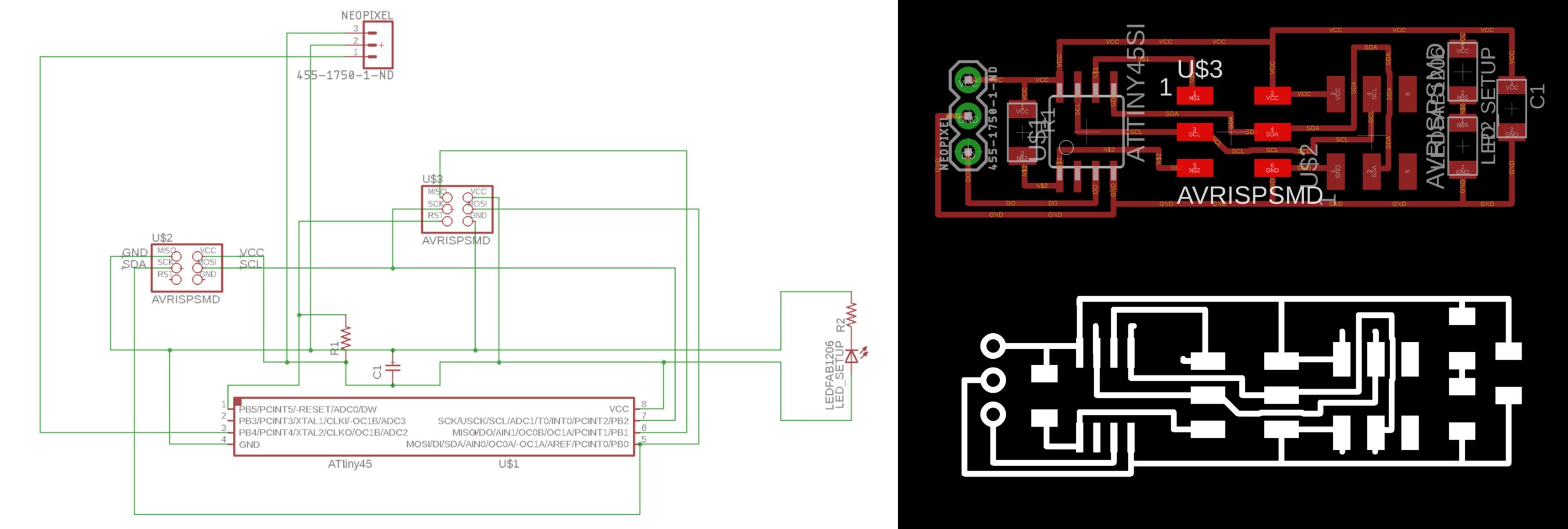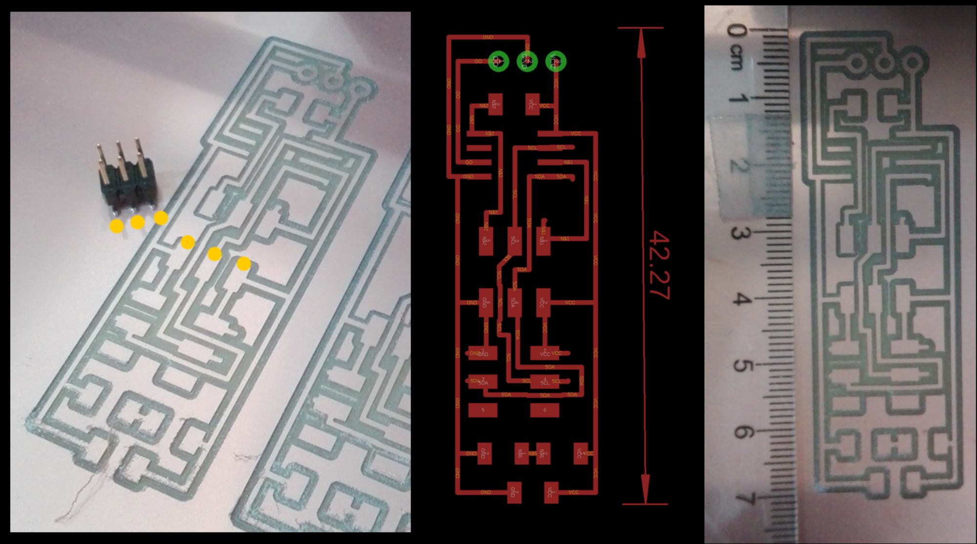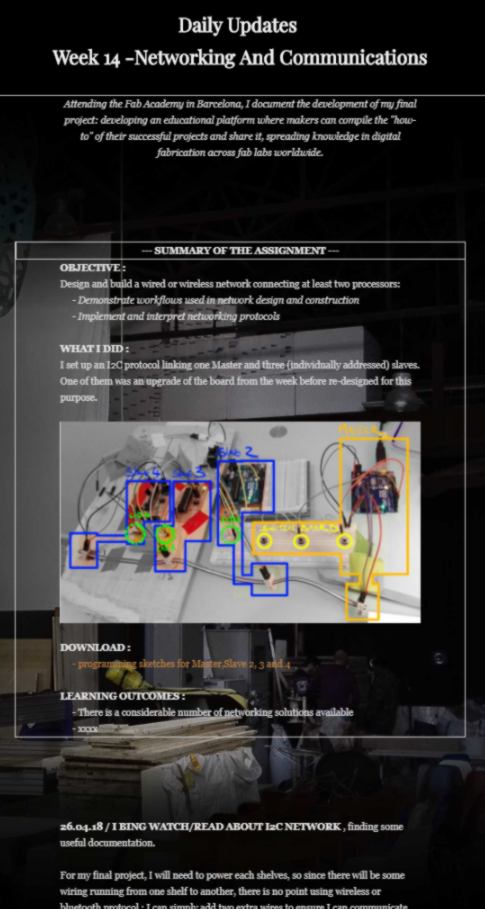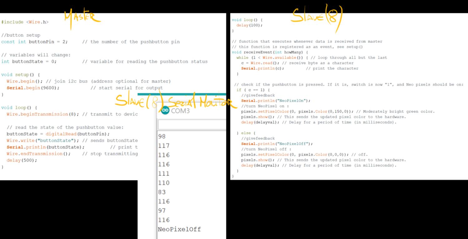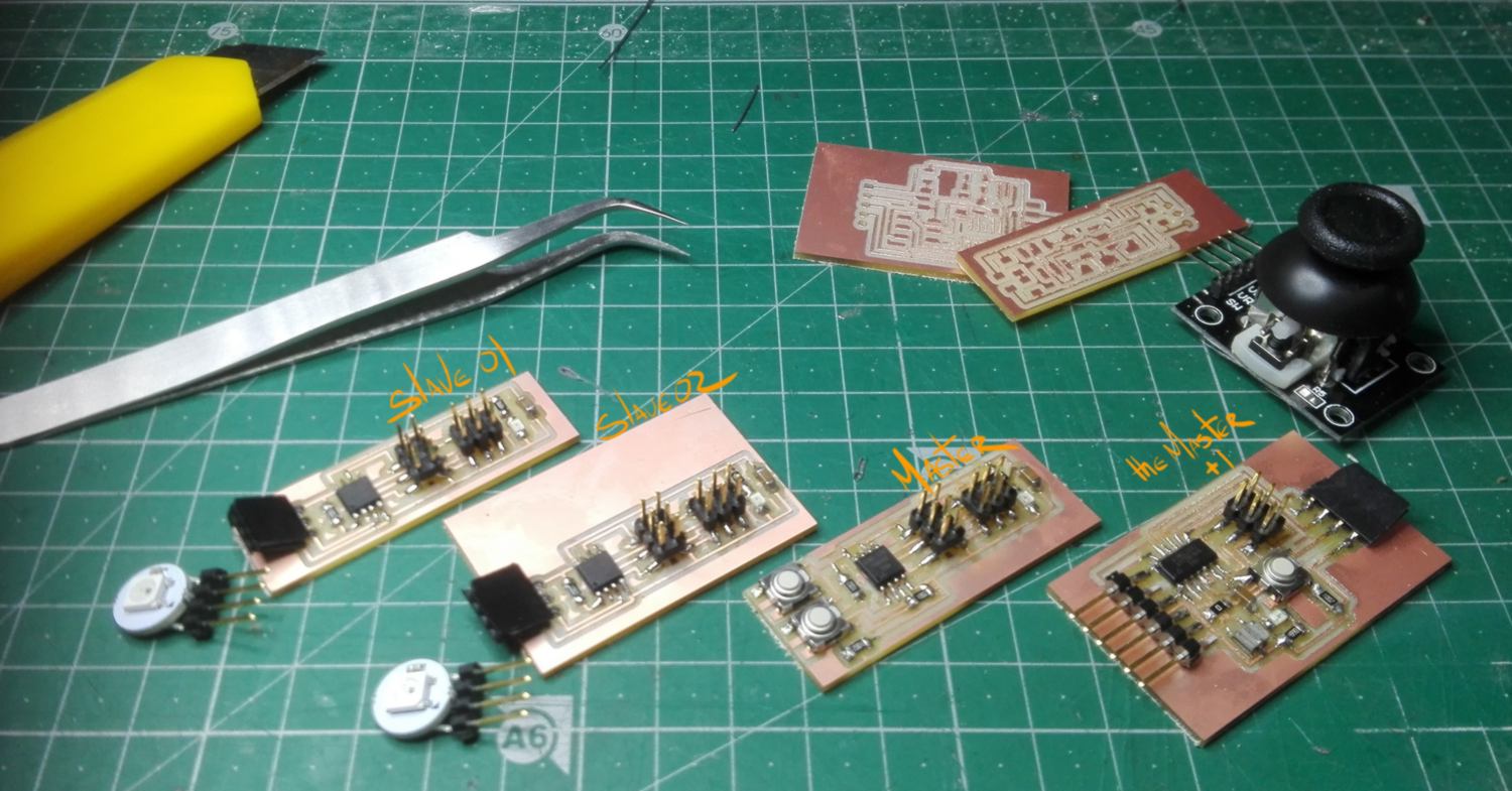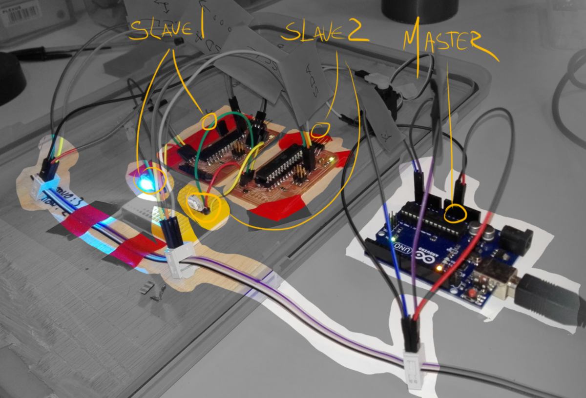 I set up an I2C protocol linking one Master and three (individually addressed) slaves. One of them was an upgrade of the board from the week before re-designed for this purpose.