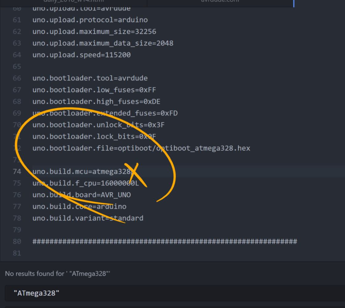 28.04.18 / I2C day today, I attempt to load some code on both chip from this tutorial, one as a master, the other as a slave. Since I do not have a dedicated programer with me I will use an Arduino to bootload and program my boards. I receive an error message while bootloading: