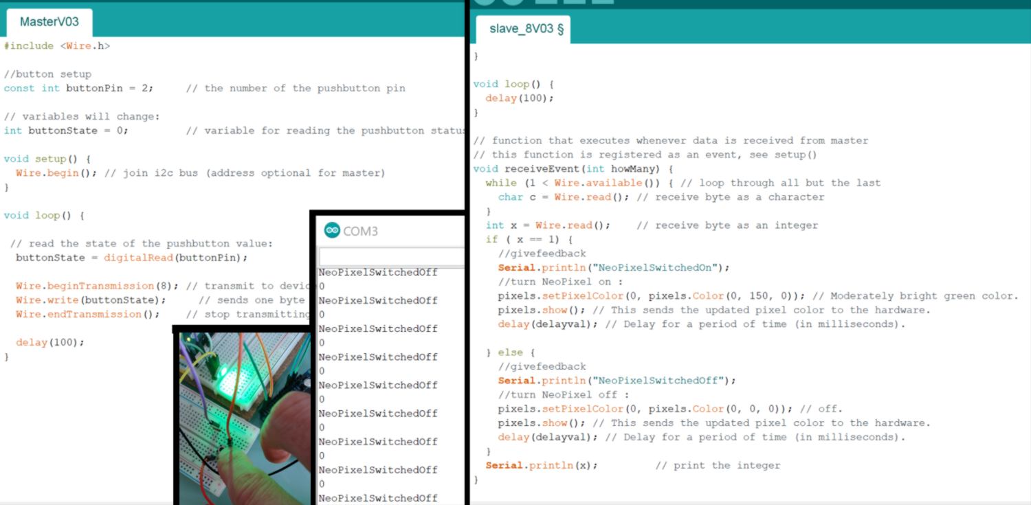 To test my code, I need at least one side (either Master or Slave) that is functional. I revert back to the original I2C tutorial. I can easily verify what my Master sends through the slave serial, so I add the part of my code related to the button and use the variable generated as data sent through the I2C. I works. I then add my if statement to the slave code, triggering the NeoPixel to be switched on if the slave "reads" a specific value (here"1). It works: