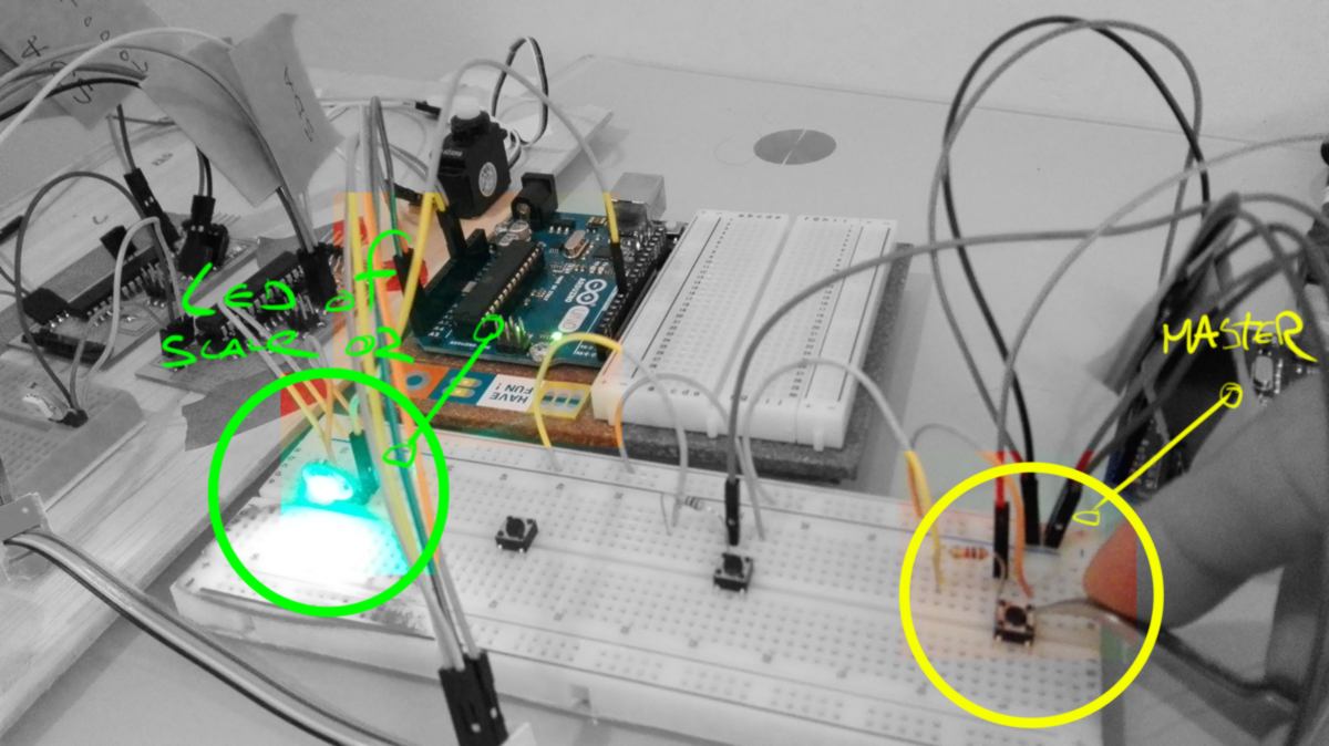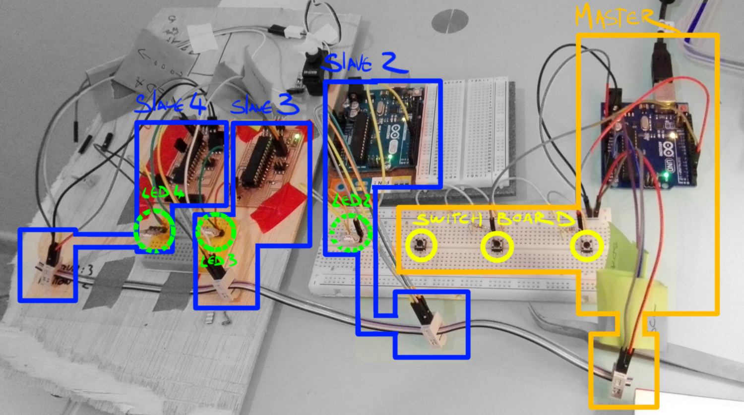 I have yet to upload the sketch for slave #4 (microcontroller on the left-hand side). However the setup works, I added an extra arduino as a slave to prove the point that I2C allows connexion between many devices at once.