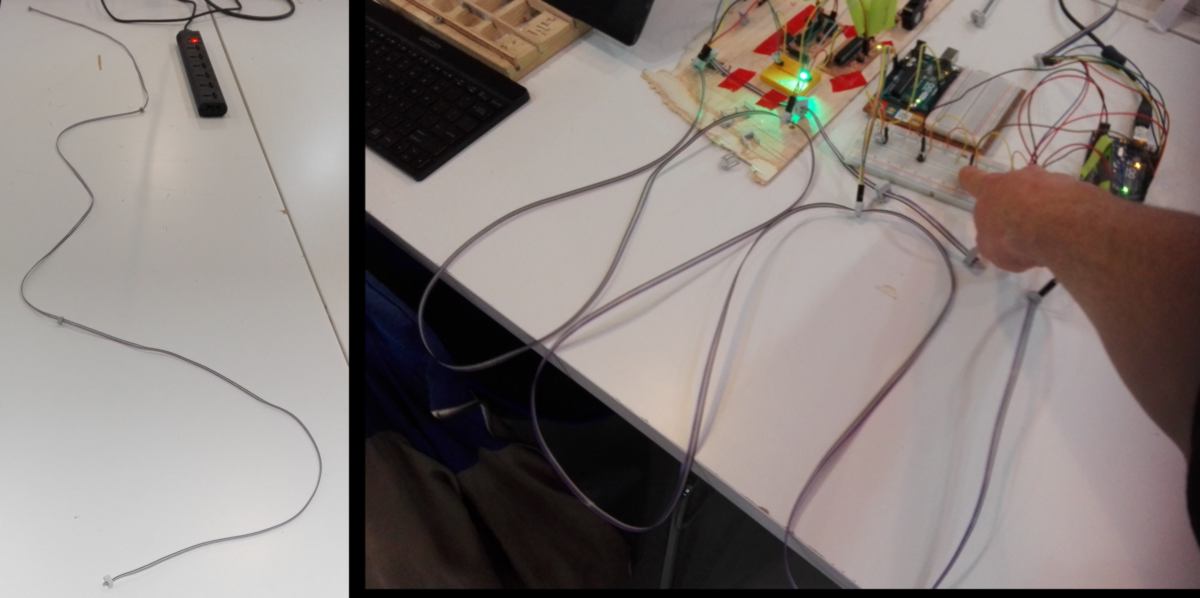 Back at the lab, I attempt to connect all my slaves and my master using a cable reflecting the distances between learning kit of the shelves. Each node will be 60cm apart :