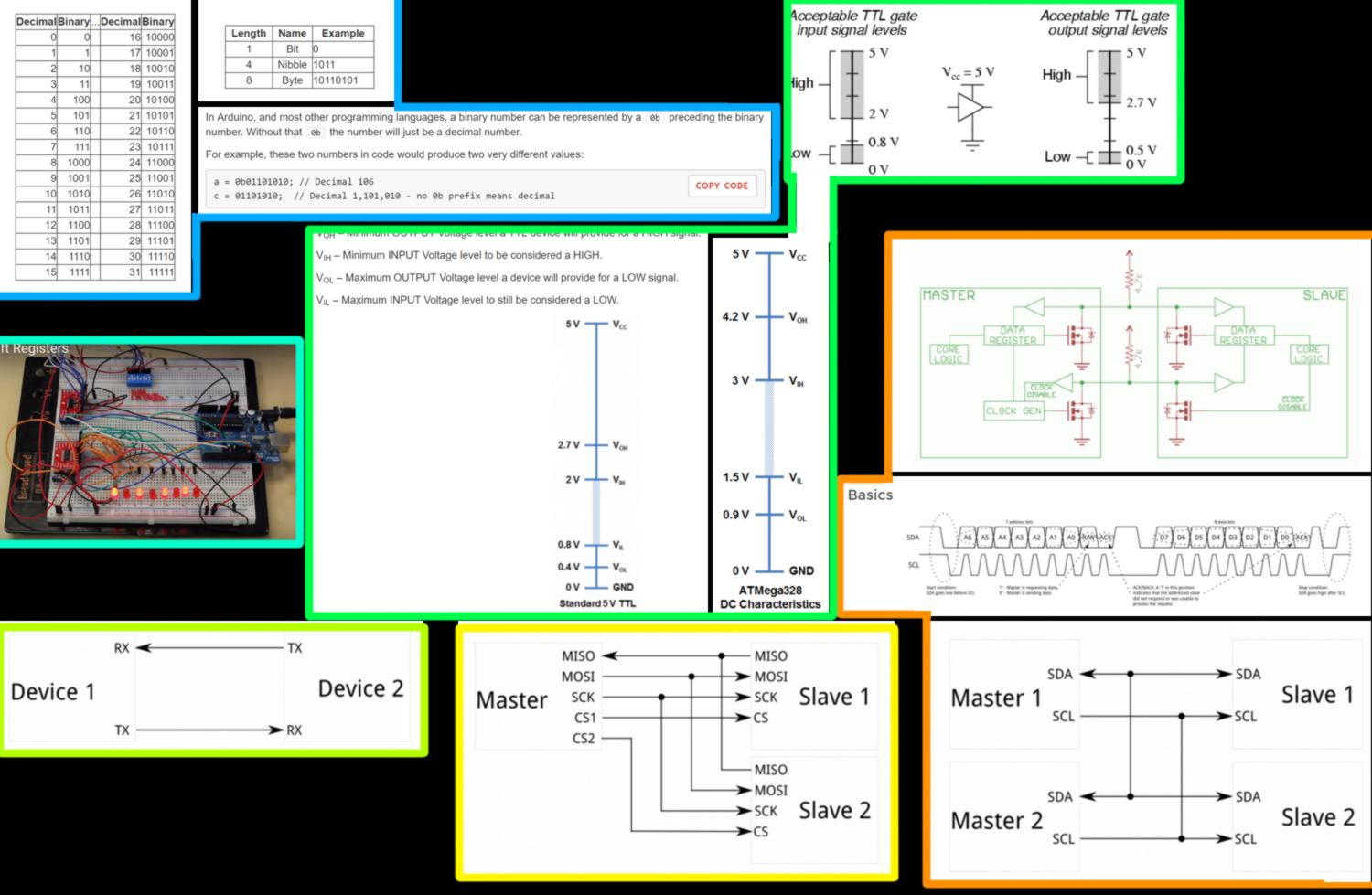 Before moving on I am having a proper read at the Sparkfun webpage about I2C. I learn about binary (which includes a definition of the very quirky word "radix"), shift-registers (very nice video), logic levels, SerialPorts ( inherently suited to communications between two, and only two, devices), SPI (good for high data rate full-duplex, but allows for only one master in the network and requires 4 pins by default plus an additional pin per extra slave), and of course I2C.