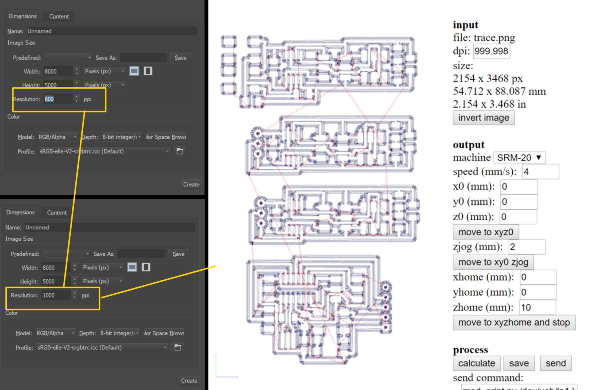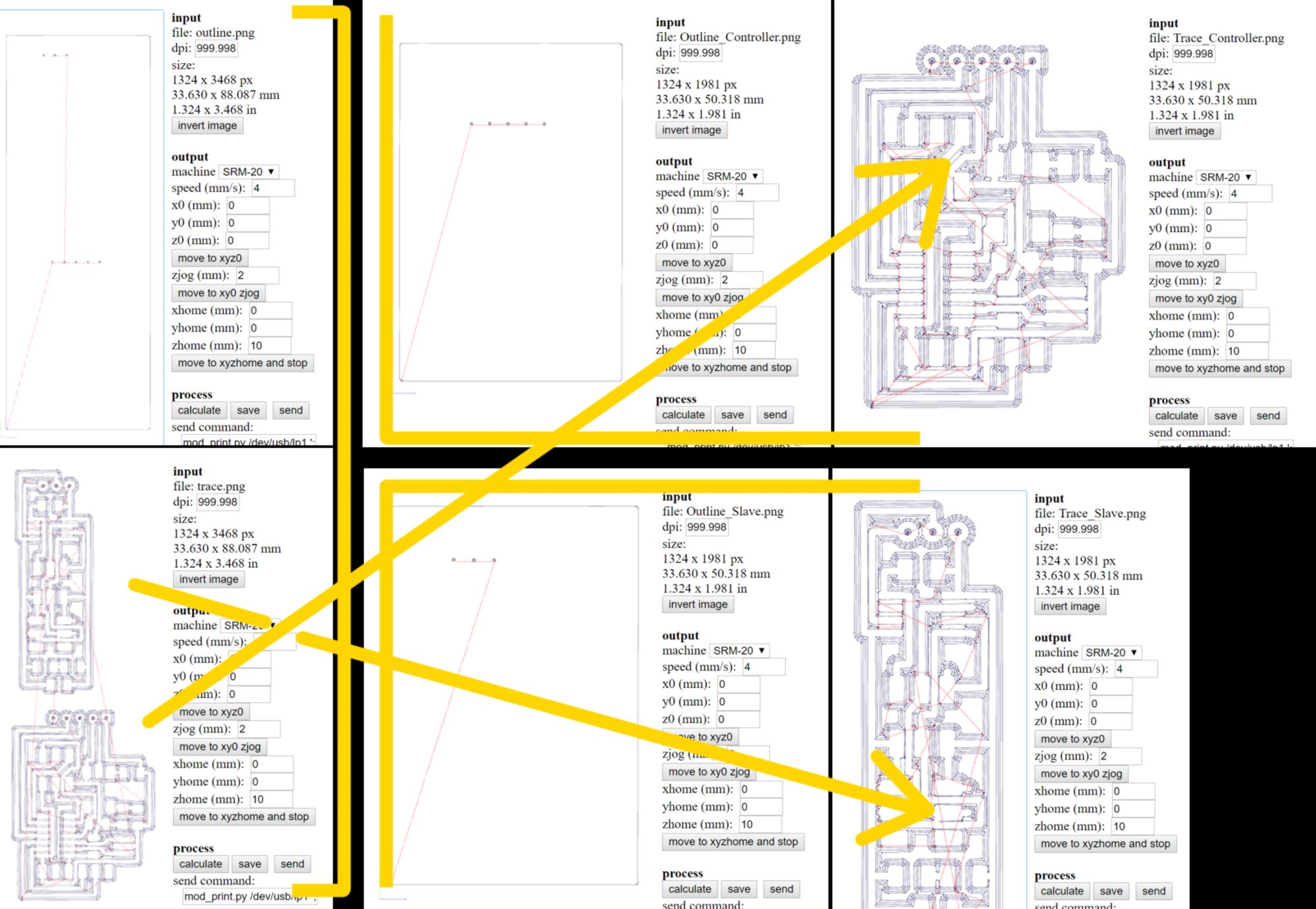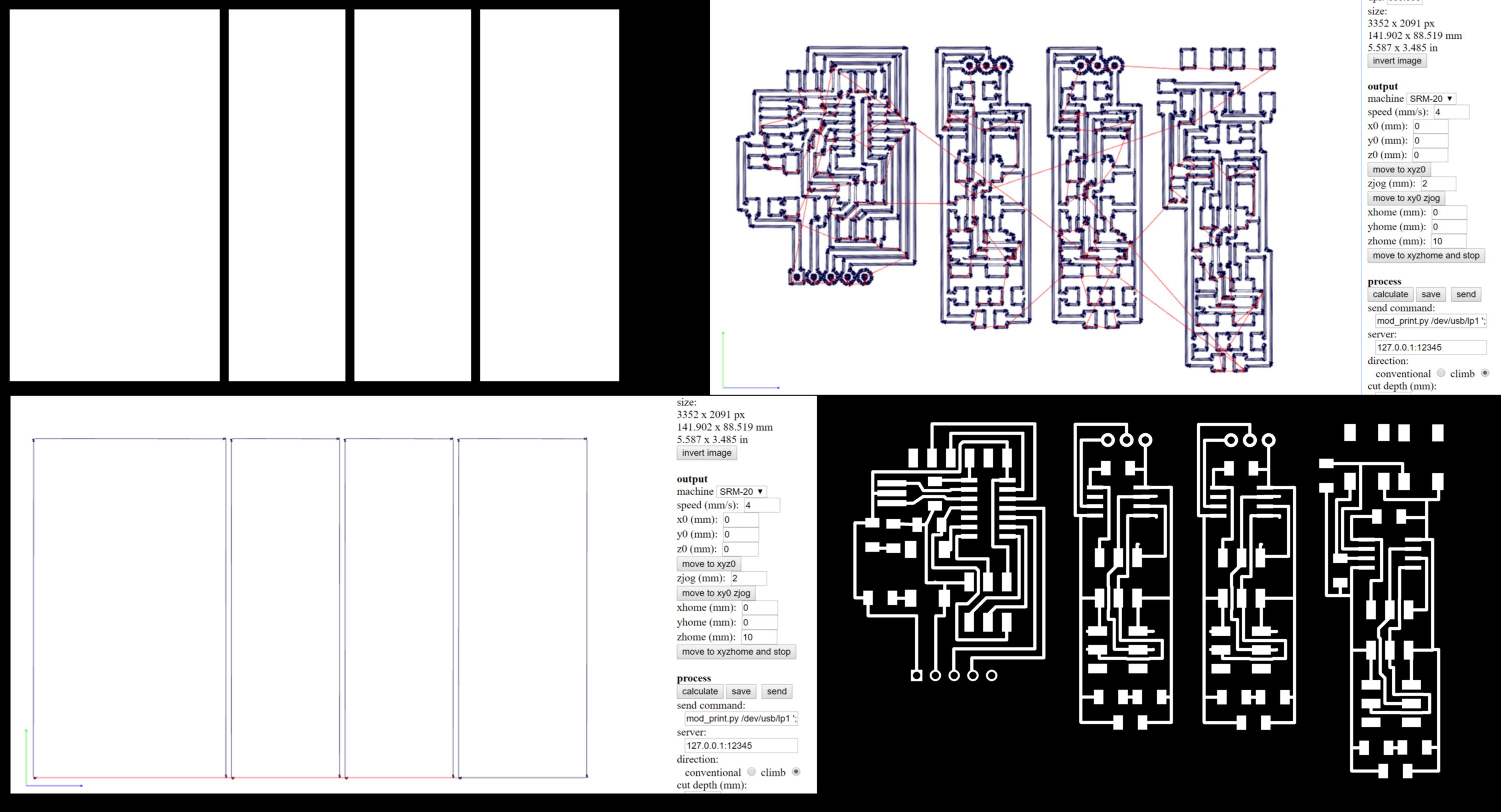 I plan on re-cutting the two boards at the bottom. I prepare the file. However, on the right-hand side of the PCB, the height difference between the front and the back of the bed is even more pronounced. I decide to split the file in two (one per board) and cut them successively, adjusting the z on the lowest point for each of them :