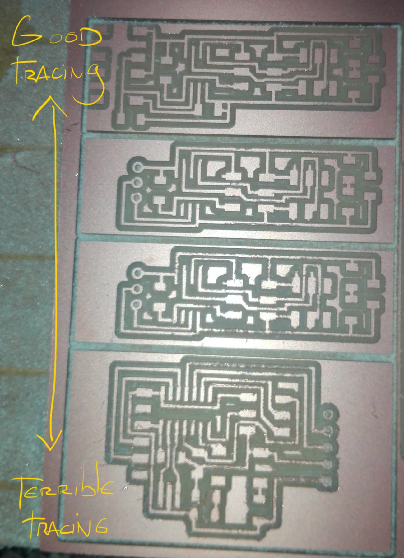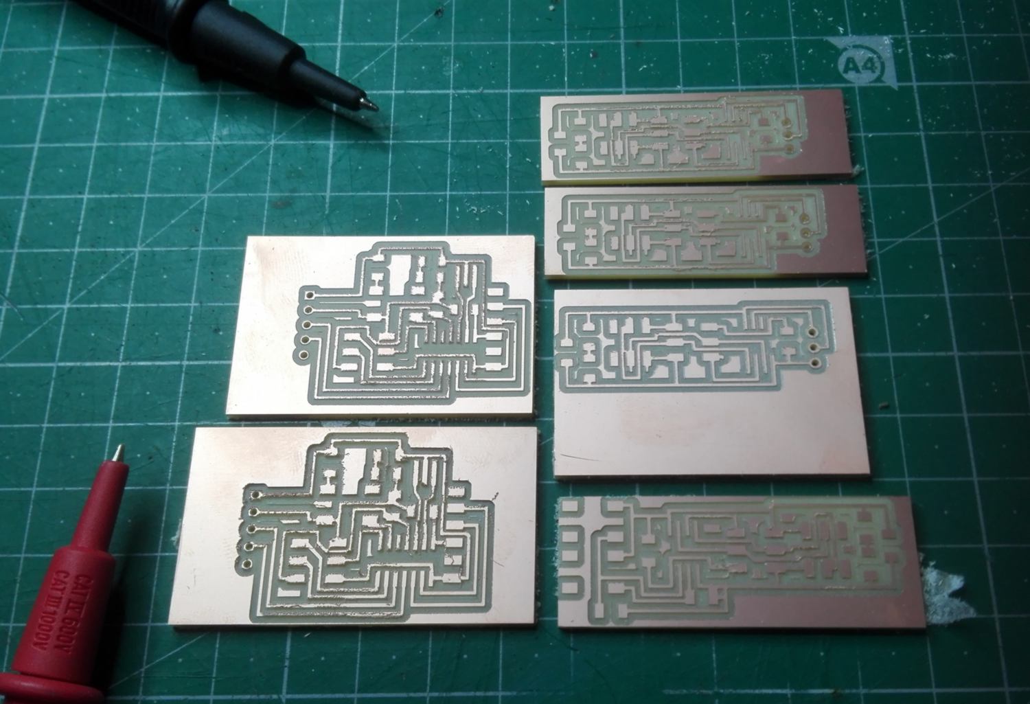 Unfortunately the tracing on two of the boards (at the bottom of the picture below) have been badly traced. Since I have set the origin in Z lower, the end mill has scraped the traces with the toothholder :