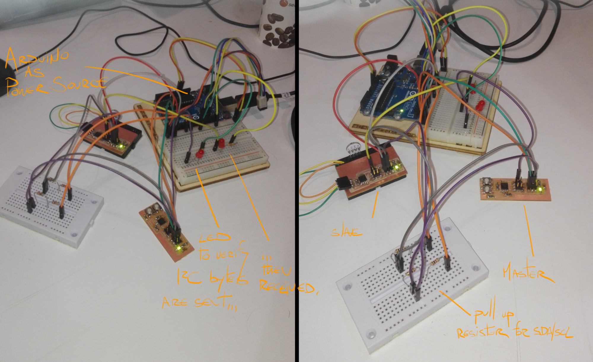 I also designed and fabricated a set of two slaves PCBs and one master PCB to set up a similar I2C network.