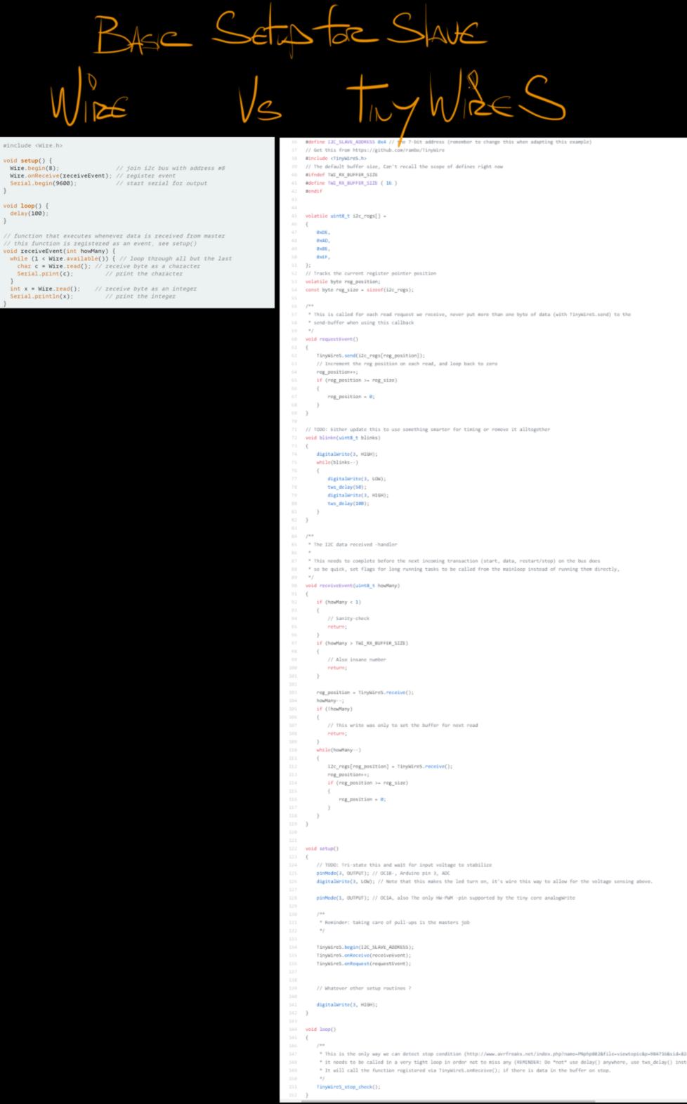 My last read is the Wire library detailed reference, which : " attempts to {...} give the Wire library the documentation it needs and deserves." I learn that on the ATmega, there is a specific piece of hardware, the TWI, that will handle the communication. Some of the documentation is still a bit cryptic but knowing what the general concept is (see diagram below) I get an understanding of how the TWI reacts to the call of different variables.