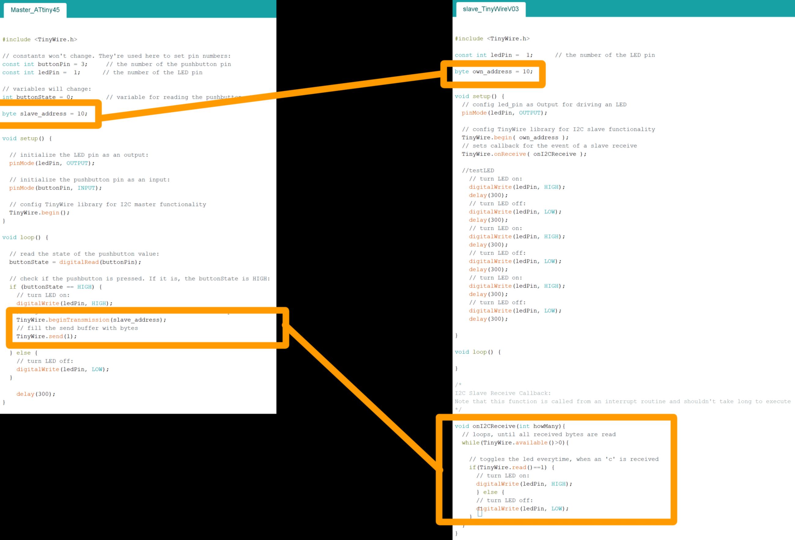 The next step is to add an extra microcontroller to the setup. I first need to modify my master code so it sends input to another microcontroller using another button, and duplicate my slave code :