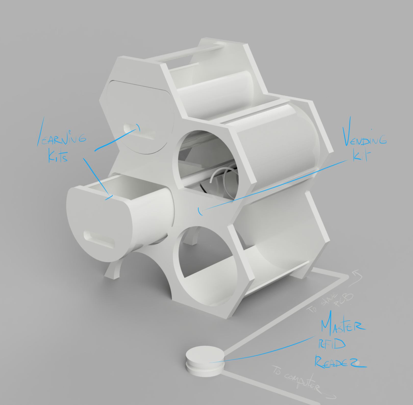 Since the learning kits are unlocked according to the level of the user, an identification system is required. Until this week, I had considered using RFID on each drawer to give or refuse access to each kit. This involved setting up an RFID reader and a processor for each learning kit as well as a locking system, all connected in a I2C network. Adding to the issue, each drawer could be put back in any available slots in the structure, so the RFID and electronics had to be located inside the drawer itself, which brought another problem to solve how to provide connexion and power to these pieces or electronics? Pogos connection? Something else?