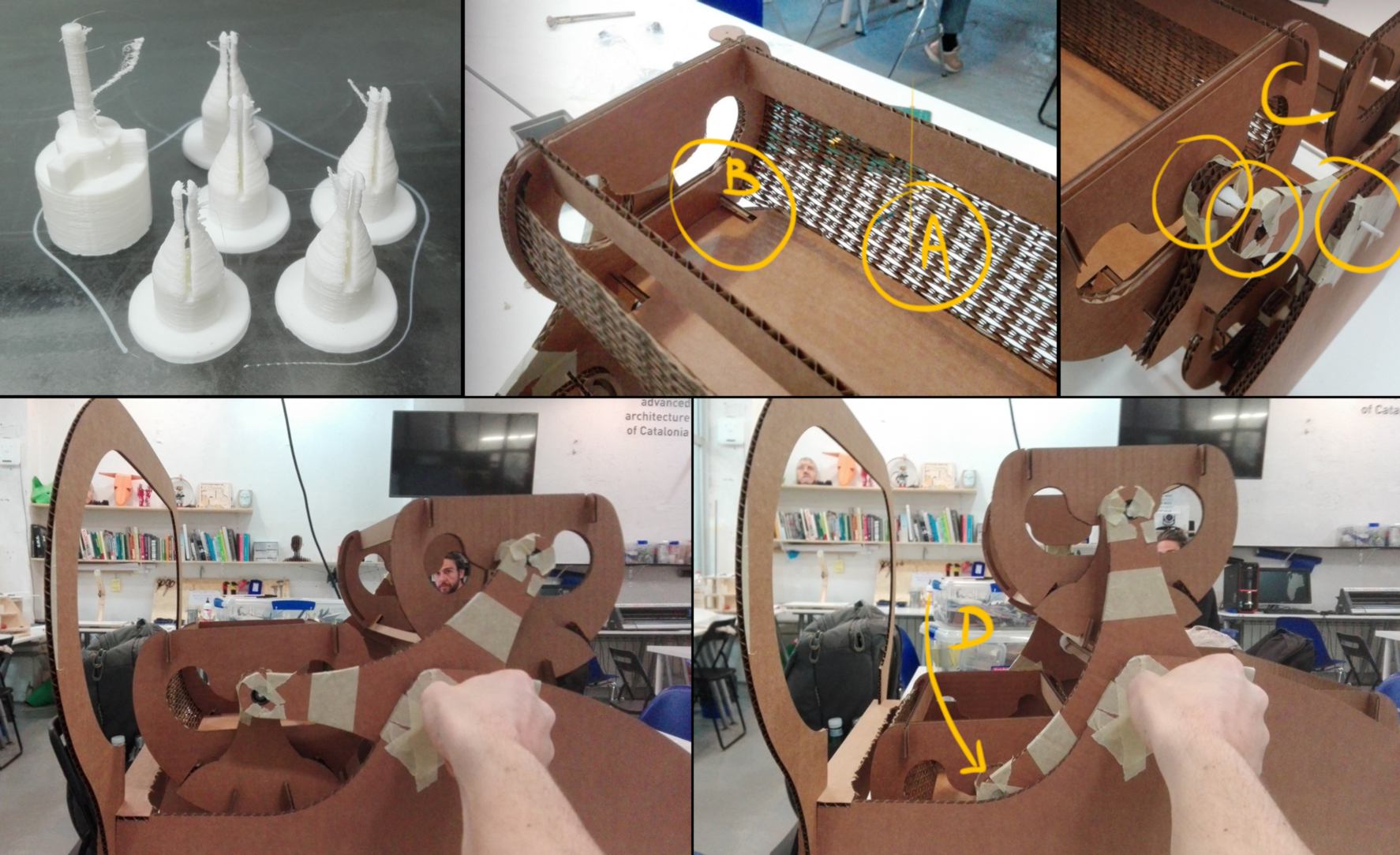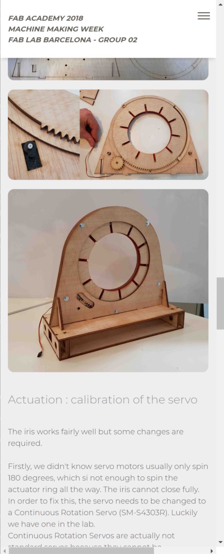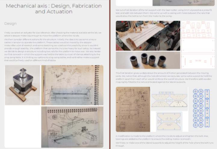 16.05.18 / I come back to Barcelona after a week away and discover with delight that my team has been developing the machine smoothly. When stepping into the room I see them playing with it, fully operational. Not only it is impressive effort wise, but it also looks good! The iris has an appealing design, the motion is smooth, and I am looking forward to bring it to the Makerfaire in June! The only hiccups of the design is the sound : the stepper motor driving the belt makes an awfully loud noise!