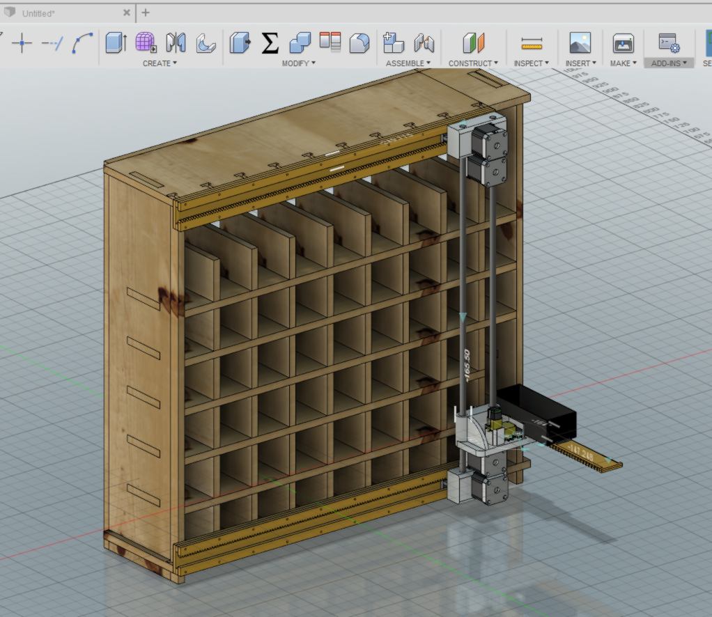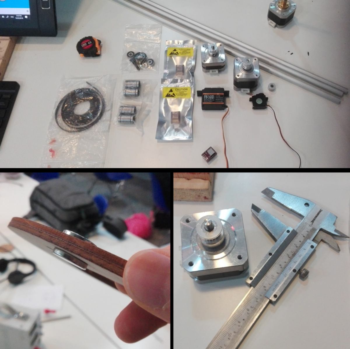 I head to the lab to find the pieces required, but there is not much left after the machine making week. I am missing the rods, which I order. I source two stepper motors (one per axis), bearings, drivers, a belt, some magnets and miscellaneous items. I start measuring some of them to integrate them to the digital design.
