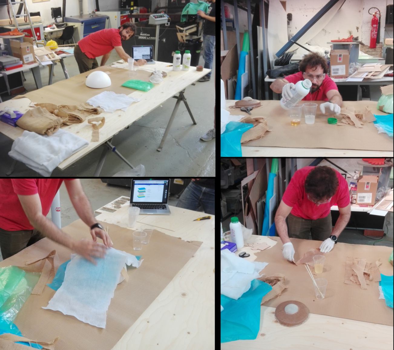 In between two design sessions, I swing by the workshop where one of our instructor offers a workshop on composite material. I learn about the different layers required to suck the extra epoxy out and protect the vacuum press, general safety procedures around handling epoxy, and other related skills.