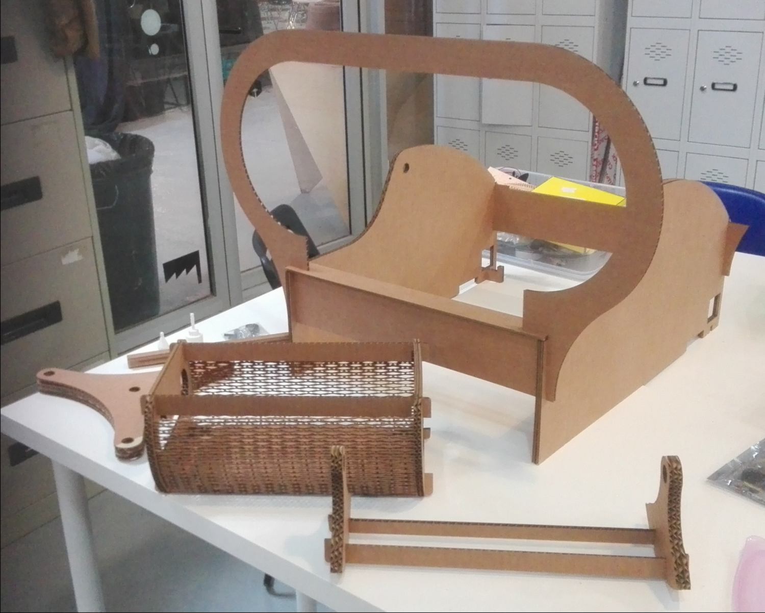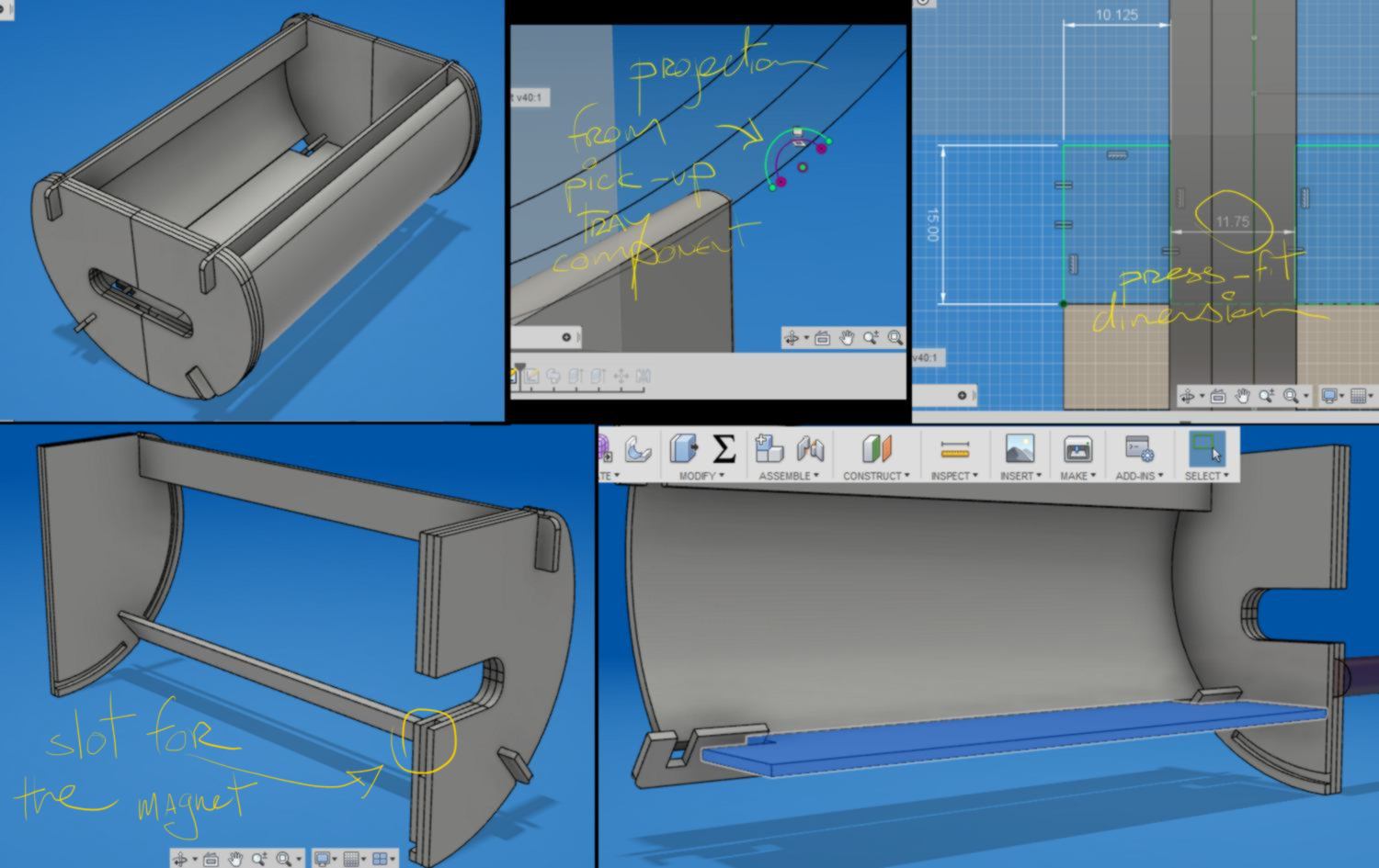 19.05.18 / I carry on with the design. I adapt the drawer to make it match the design of the pick up machine, and finalise the press-fit structure around it. I design it so I will be able to laser cut it with a 4mm sheet of plywood. I found that laser-cutting was much faster than milling.
