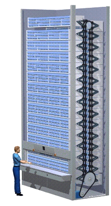 Using a single motor, this system makes better use of vertical space and provides access to several shelves. To perform the same operation, my current design would require two or three motors. I also notice that vertical carroussel are commonly used in several large-scale warehouse, which I take as a sign of reliability. I particularly like the following design, which is more straightforward :