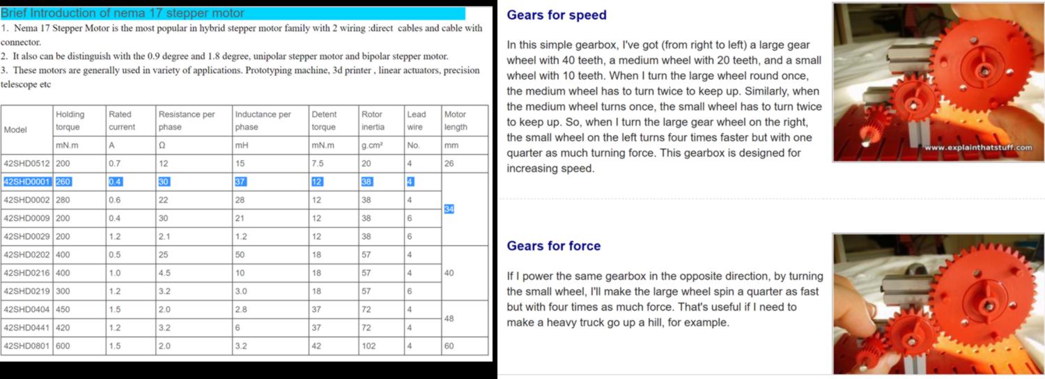 I begin to gather information about the actuation part of the design, stepper motors and gears :