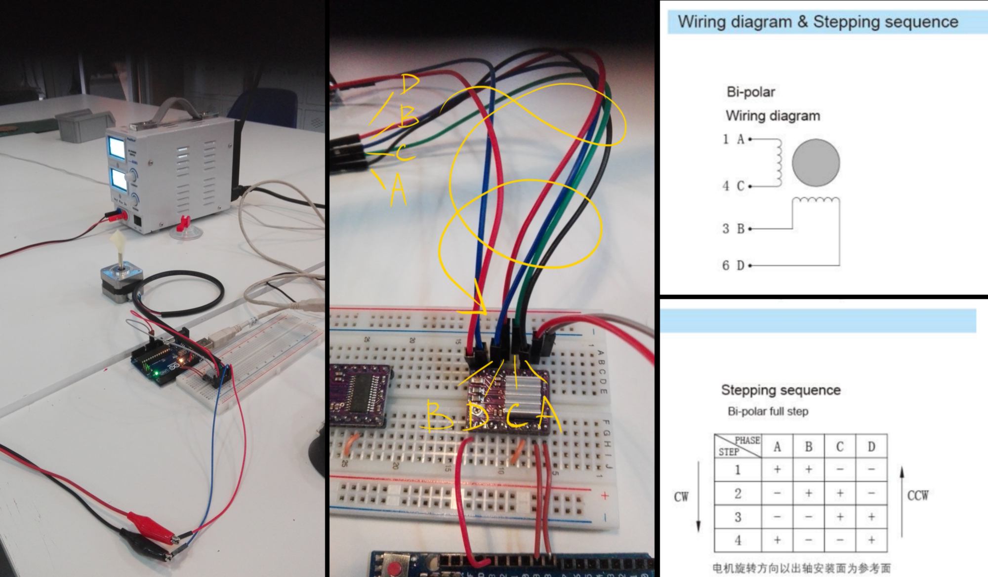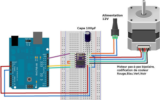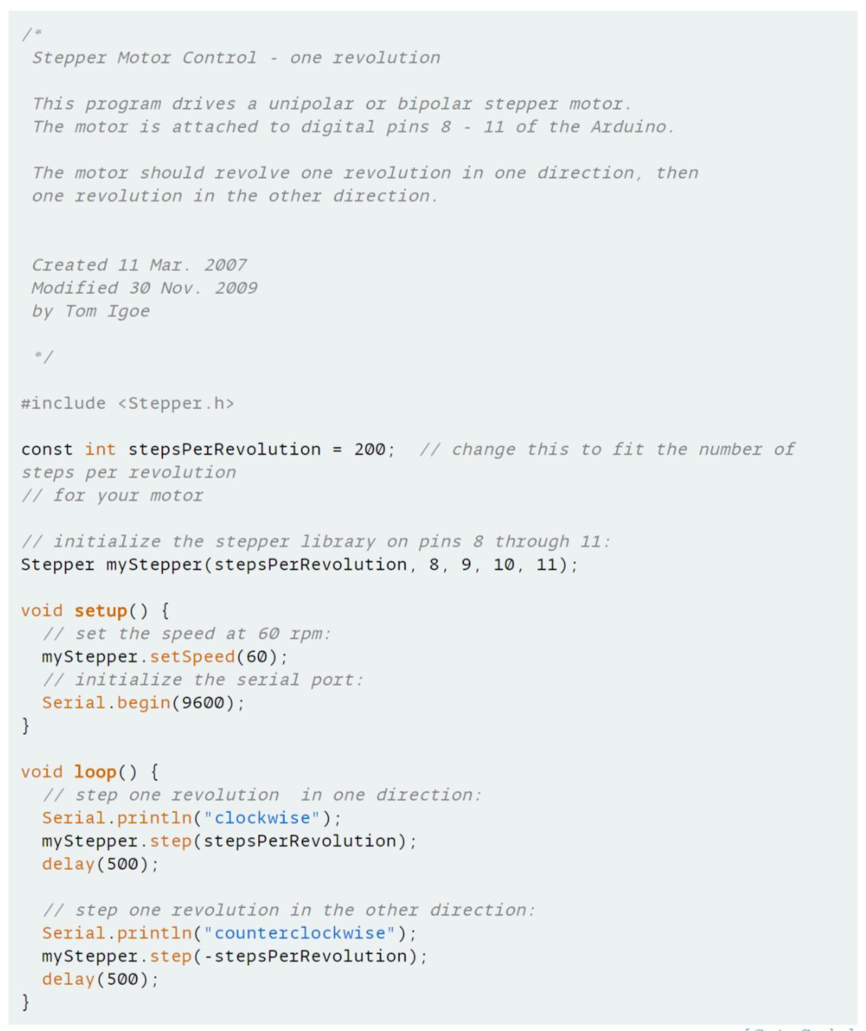 Using some documentation found on the arduino website, I set up some electronics and write some code to control my stepper motor :