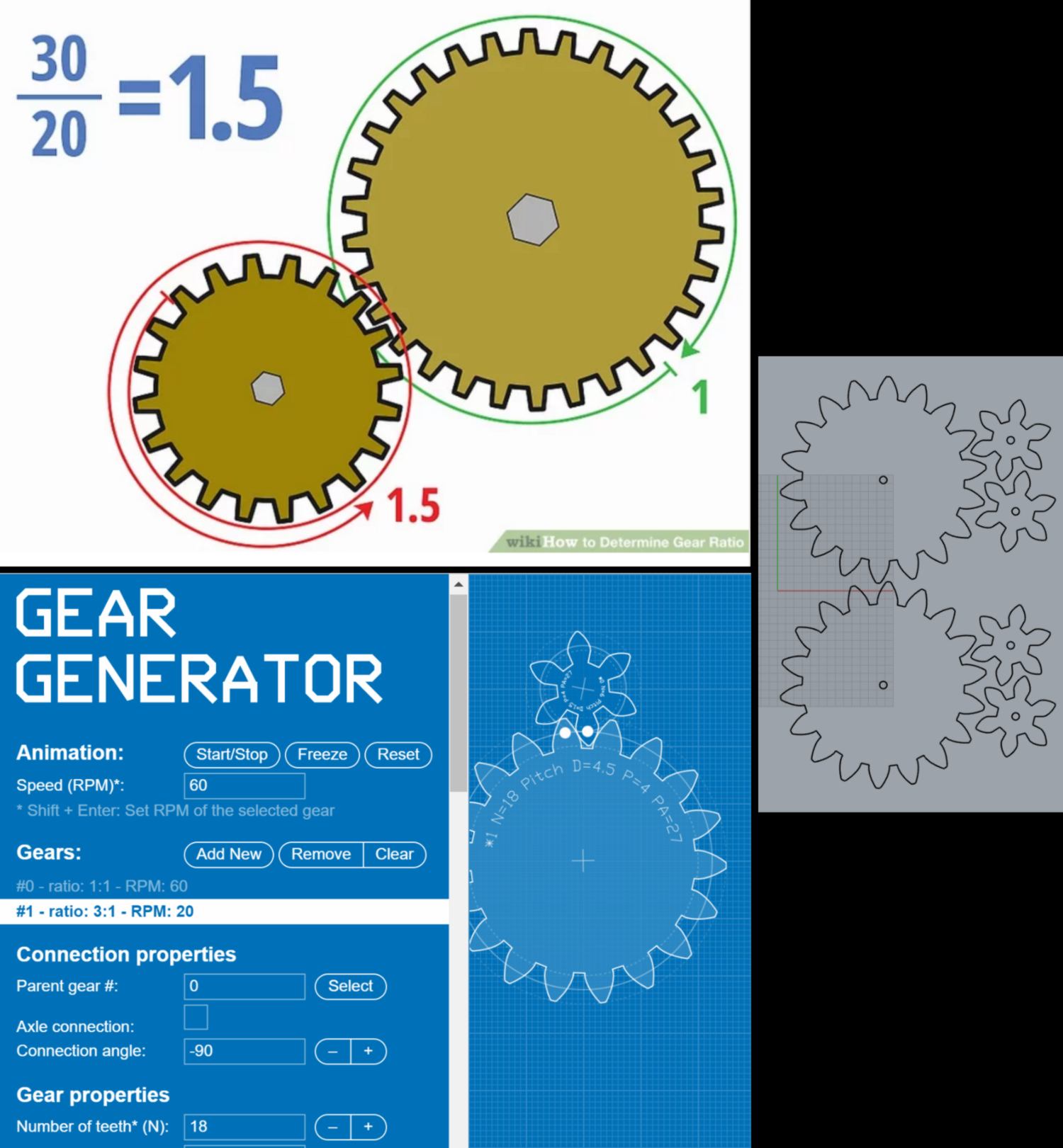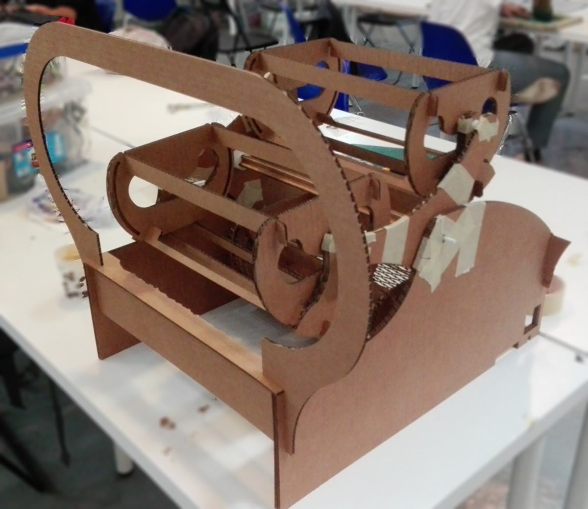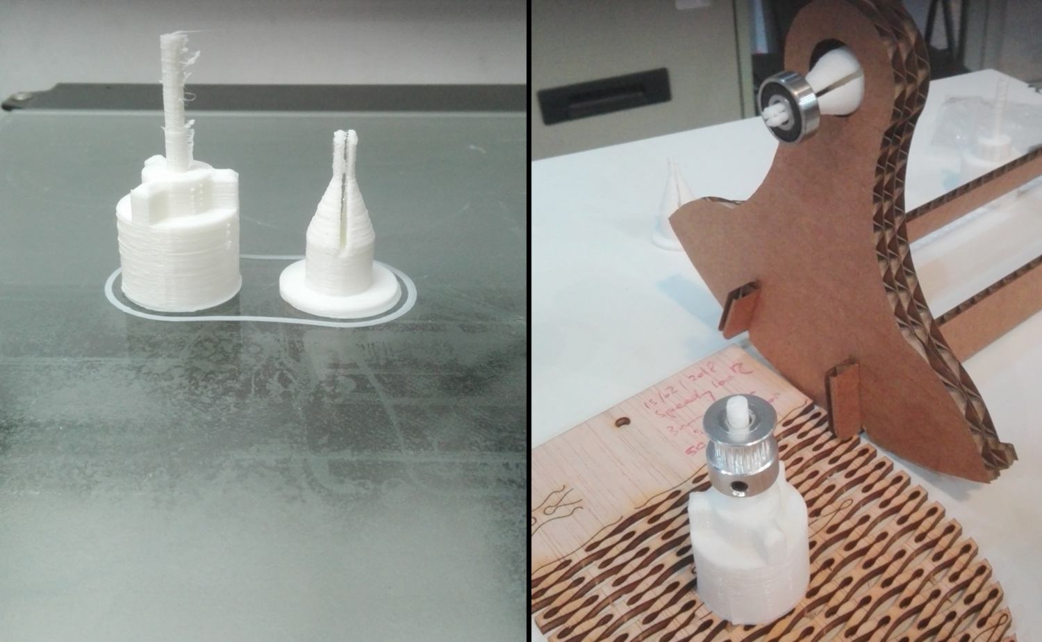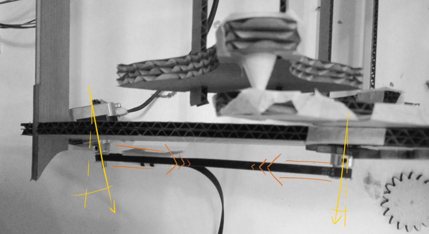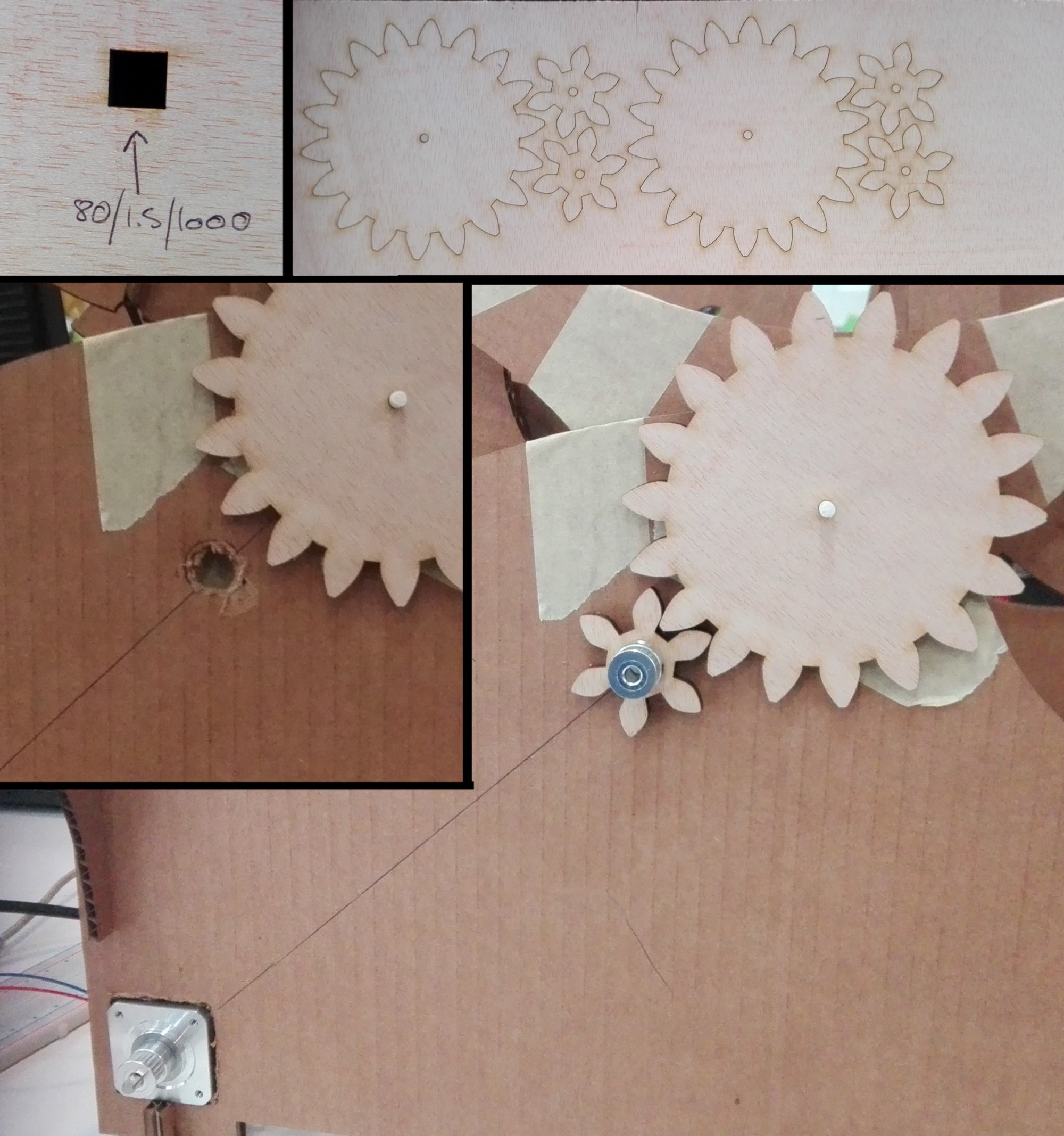 to solve that problem I look into using a gear train and calculate the accurate gear ratio. I find an online gear generator, and design a small gear with 6 teeth and a larger one with 18 teeth. When the small gear (driven by the stepper motor) will perform a complete rotation, the large gear (the mechanism) will turn by precisely 120 degrees. I go laser cut these pieces and fit them to the side of the machine. I will have to design an extra 3d printed pin to hold the gear, also fitting in a bearing lodged in the cardboard, in a very similar way as the ones previously used for the moving structure.