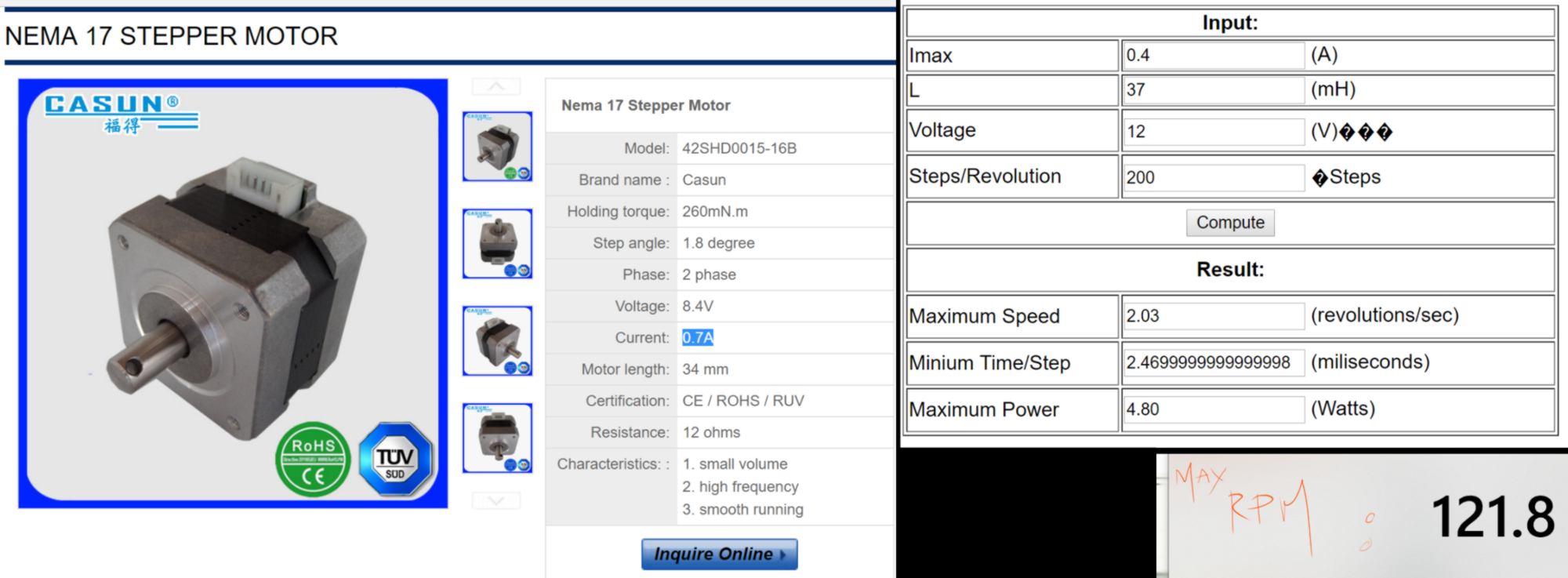 The overall amount of weight the motor will move might become important in the future, so I would rather use a gear train and let the motor spin fast to move the overall wheel slowly. I then look at its maximum velocity. To do so I use an online stepper motor calculator and a description of the stepper motor . It turns out to have a max rpm of 121.8.