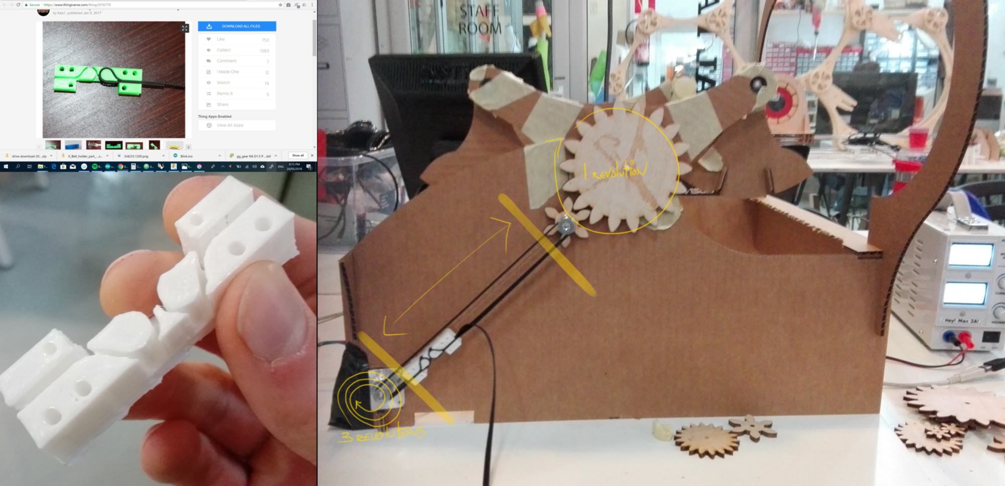 22.05.18 /I fabricate the machine using the laser cutter and the 3d printer. All cutted elements work fine. The 3d printed parts are troublesome. One is a design mistake on my behalf, which I correct (diameter issue). The other is badly printed.