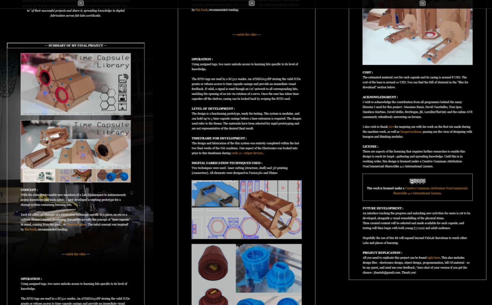 - final project page including a Bill Of Materials, Links to weeks when I worked on my final project, Links to videos and slides, design files, license chosen and acknowledgments for other people working on this project.