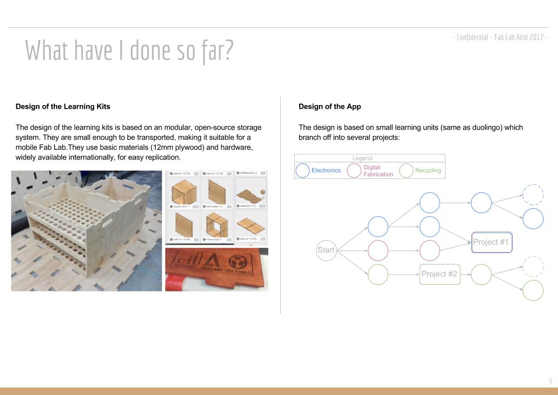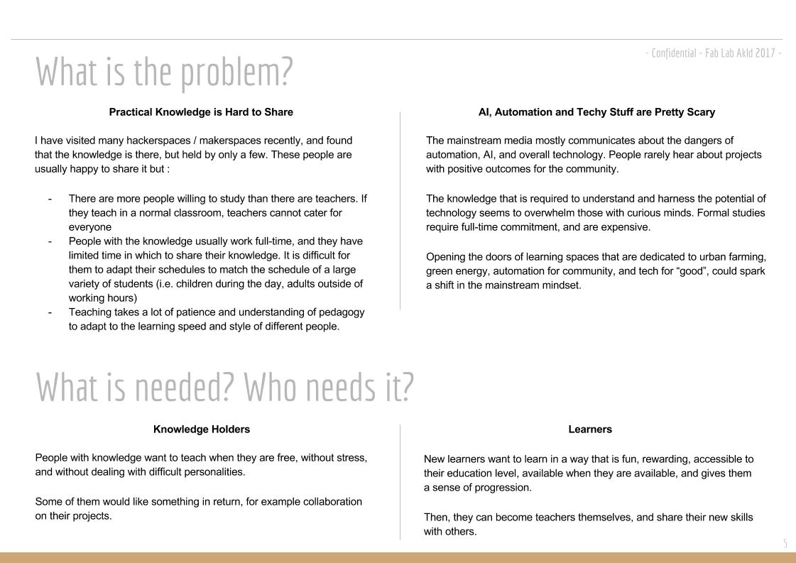 Fabkit will be deployed in refugee camps, therefore, due to the inponderable of such situation, they wish to rely on paper or written tutorial rather than videos. There is no digital interface planned. Only one person - the instructor - has access to the tools, machines and materials, and give access to learners. These contraints limit our opportunity to immediately collaborate, excepted to produce and curate the content of tutorials.