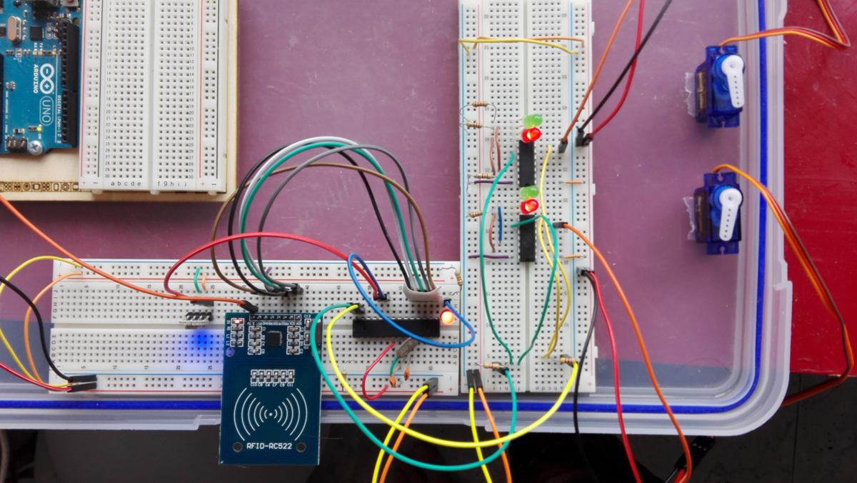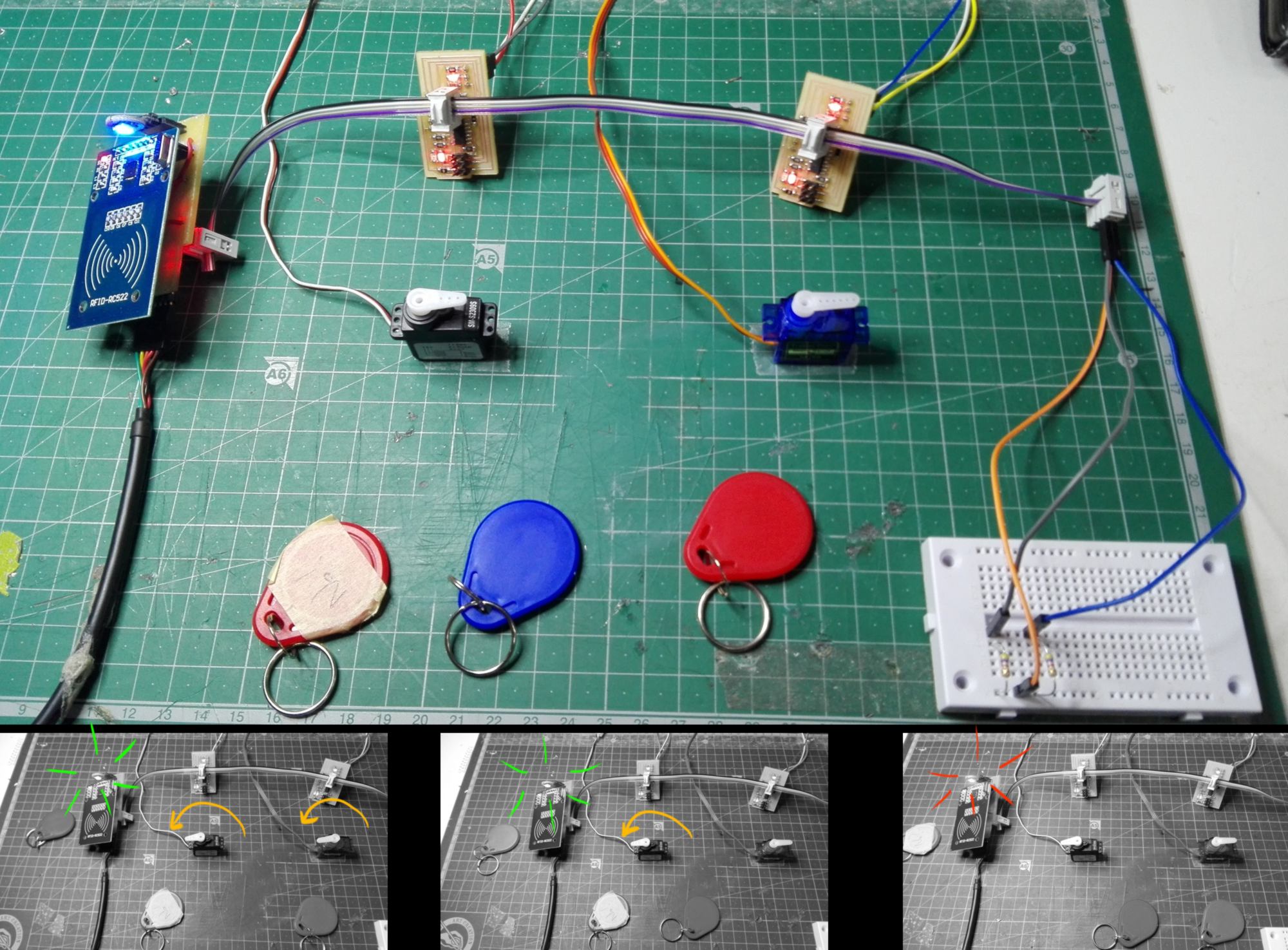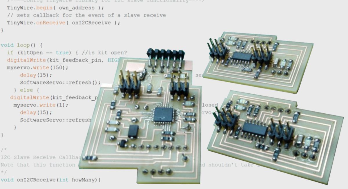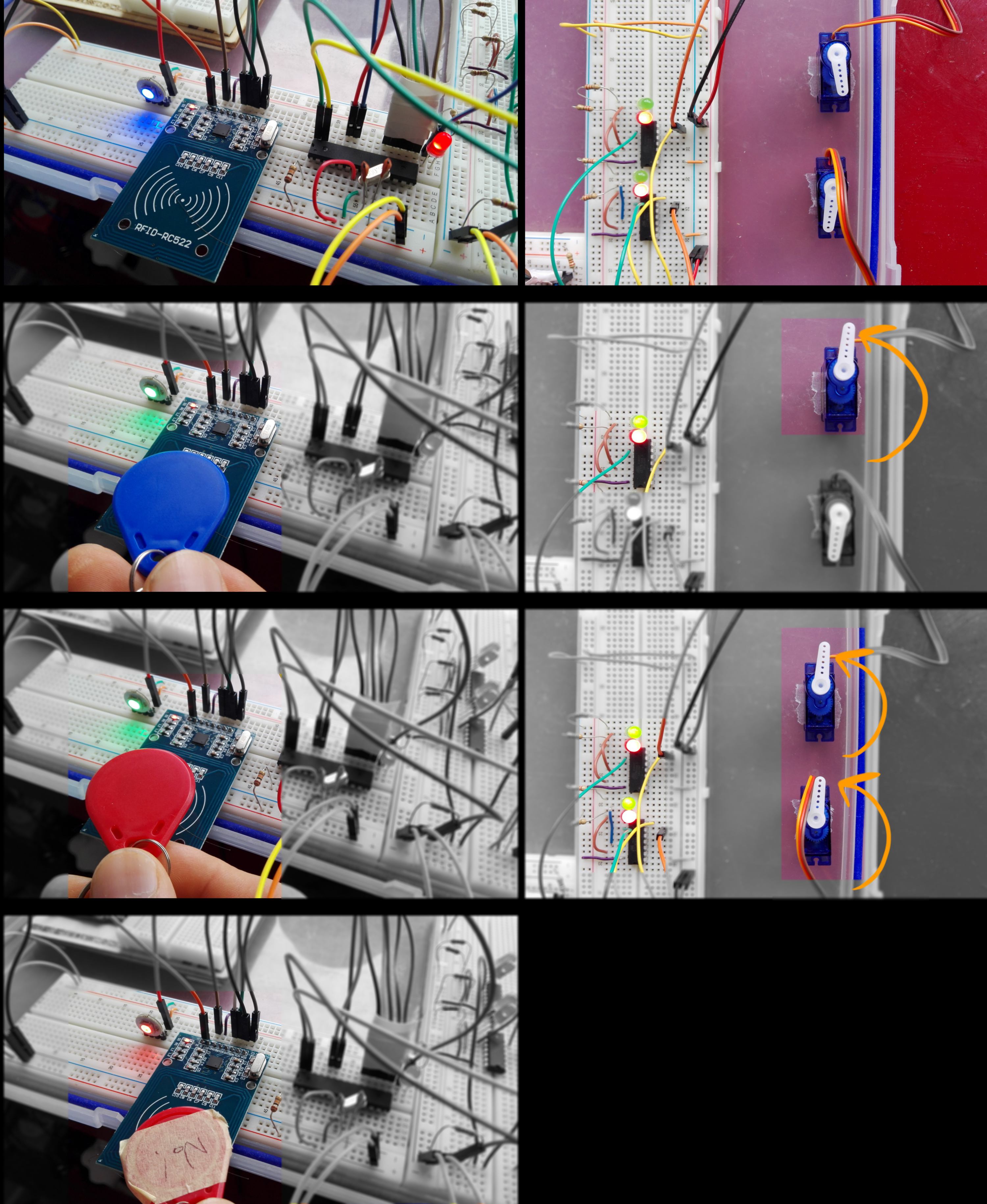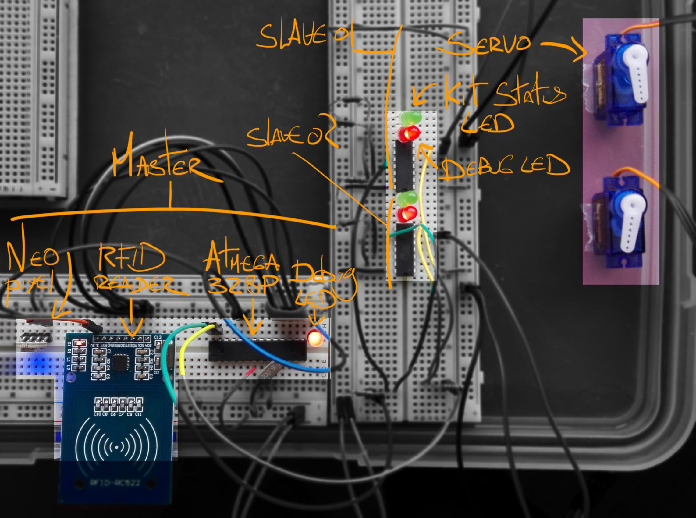 The RFID tags are read by a RC522 reader. An ATMEGA328P storing the valid IUDs grants or refuses access to time-capsule casings and provide an immediate visual feedback. If valid, a signal is send though an I2C network to all corresponding kits, enabling the opening of an iris via rotation of a servo. Once the user has taken time-capsules off the shelves, casing can be locked back by swiping the RFID card.