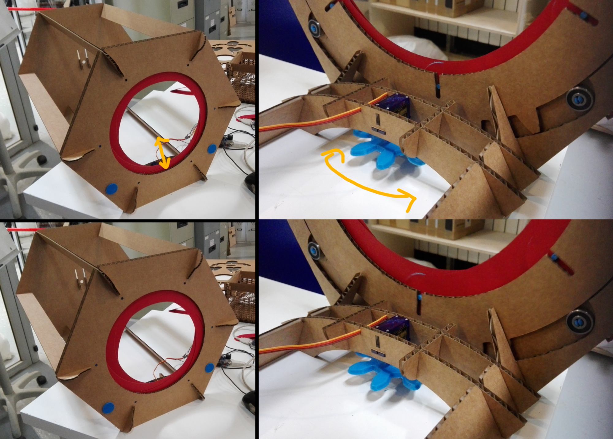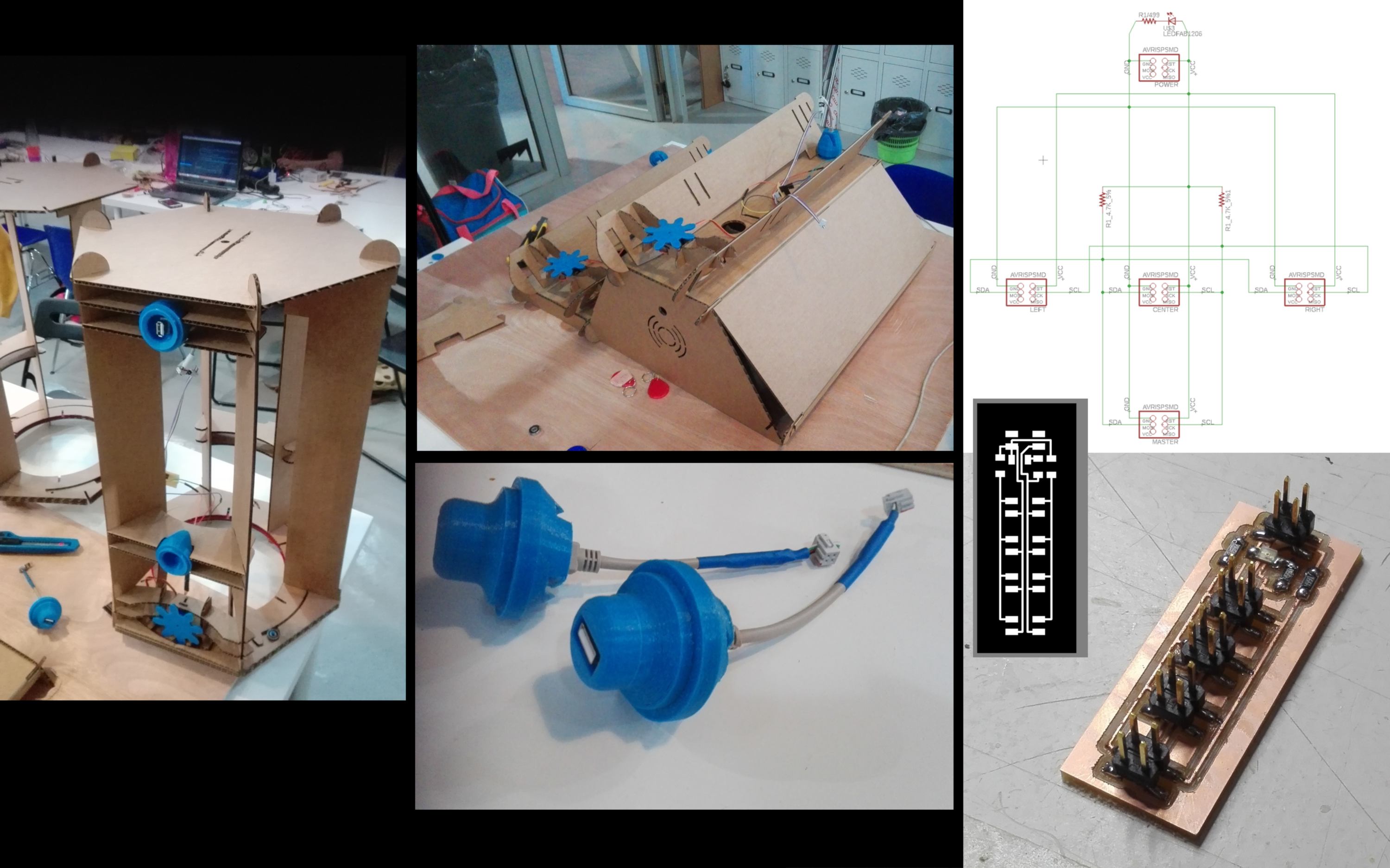 The Master board (hosting an ATMEGA328P, an RFID reader and a Neo-Pixel) and Power Board are located in the base. Each casing contains a slave board (hosting an ATtiny44 and a servo). All boards were designed in Eagle: