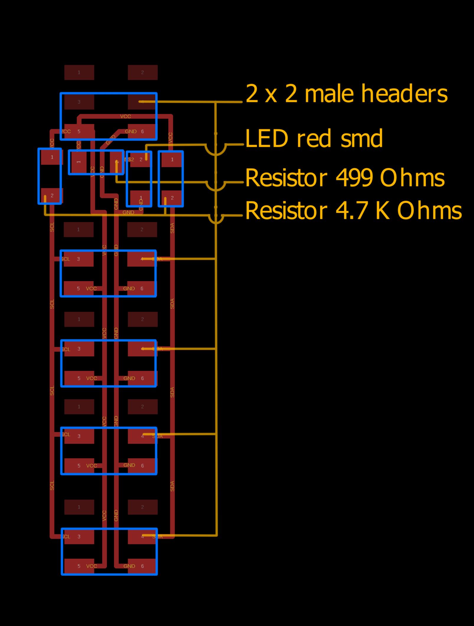 To ensure the VCC/GND/SDA/SCL are correctly connected, I used the same color for all wiring, VCC being red, GND being Black, SDA being Green and SCL being blue.