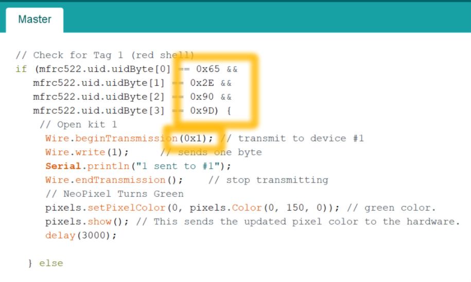For the code of the Master board, you need to provide UIDs of the RFID tags you use, as well as which casing it will open :