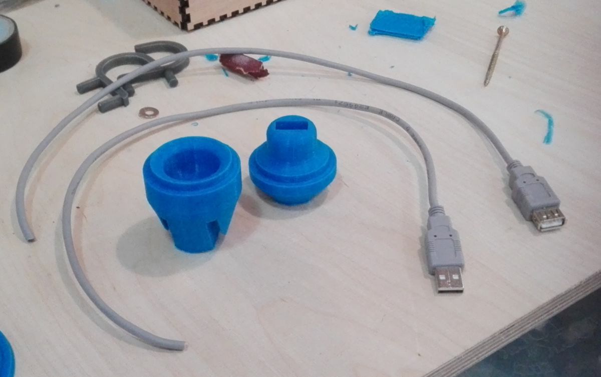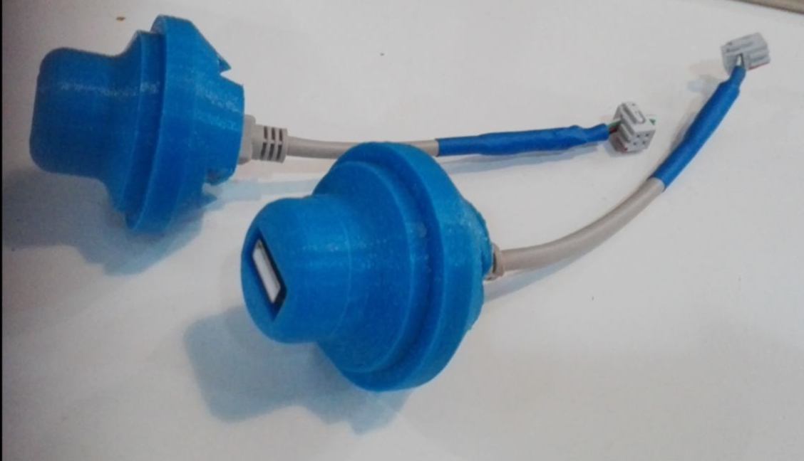 Cut each 60cm extension cords in half, then pass them through the pieces you printed earlier. You will see the female USB head (larger than the male one) fits in the female printed connector, and vice-versa. The USB header should fit very tightly. Then strip the wire and fit the four cables in a 2x2 female header as shown below :