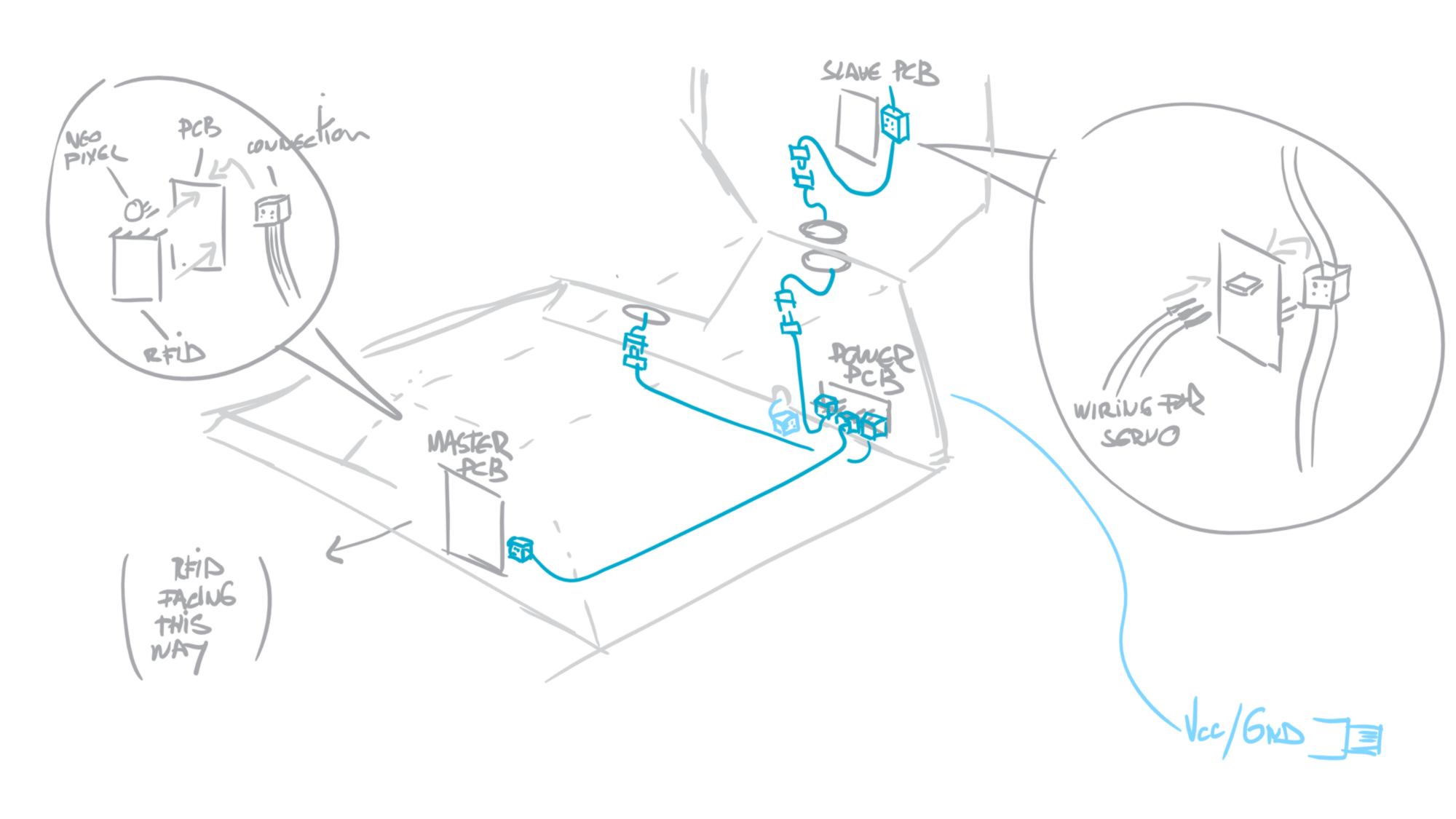 What you should have by now is a bunch of wires. This is time for a test. Power your power/connection board and swipe your RFID card to check the behavior of the whole system. Do the right servos spin for the right RFID card swiped? If so, we can put the rest of the structure together.