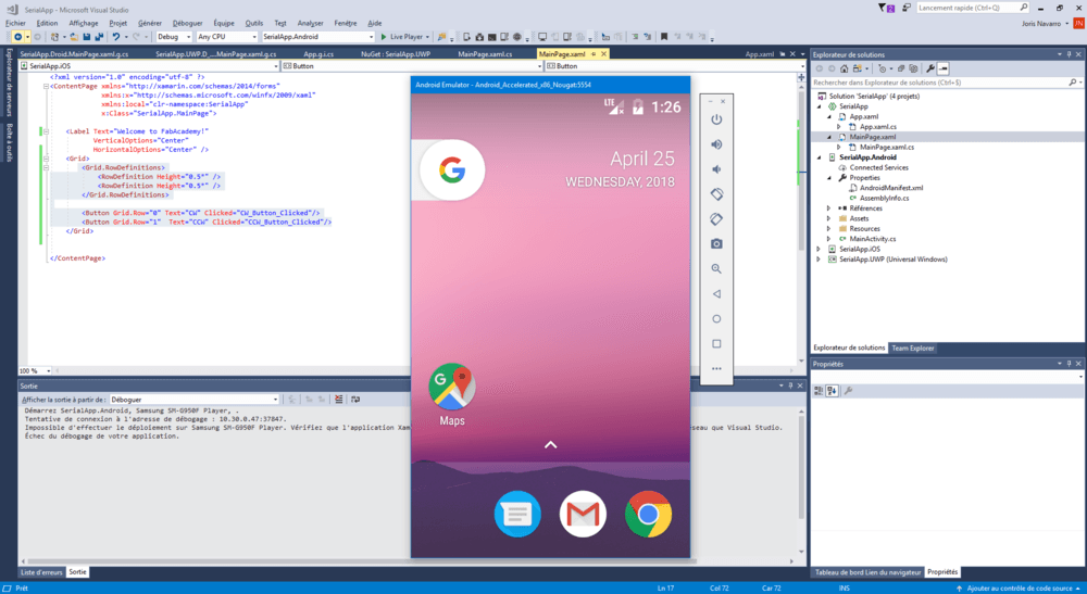 The Window object creates and open a serial connection. When data is received it display in a label. The difficulty here is to display on the UI thread an information read in another thread, for that I used the grlobal Dispatcher.