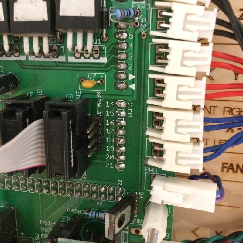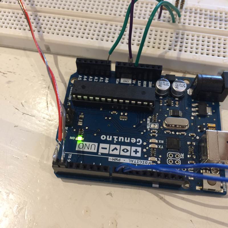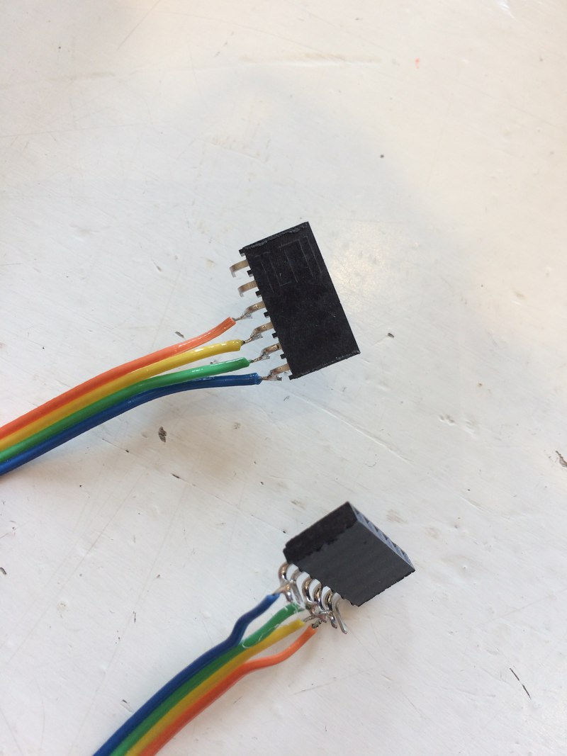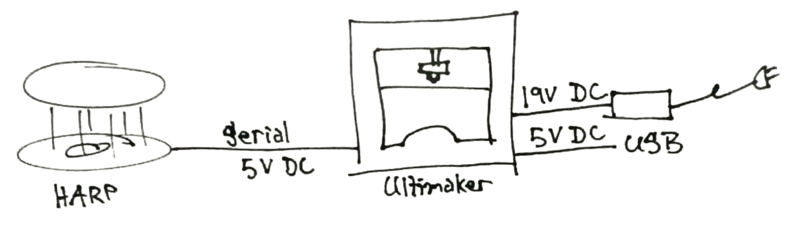 Ultimately, I knew that the 5V pin from the ultimaker could power the Harp's Arduino, so I decided to have the ultimaker power the harp. I made a ribbon cable to connect them (it has since been replaced by one using heat-shrink to isolate the solder joints):