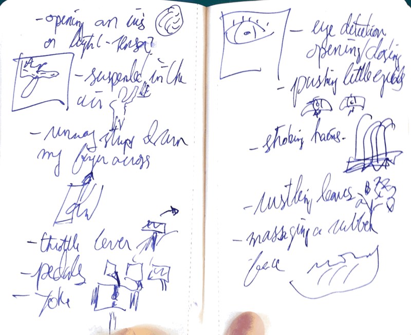 This would require the creation of a physical interface, using either casting, cutting or printing. The interface would depend on what can be controlled of the machines, but could be traditional sliders and knobs, or accelerometers, computer vision, photo resistors, IR proxmity sensors, etc. There are no sketches for this. This proposal requires learning how to use the machines before I can fully formulate a proposal for how the interfaces would work with a performer.