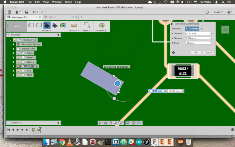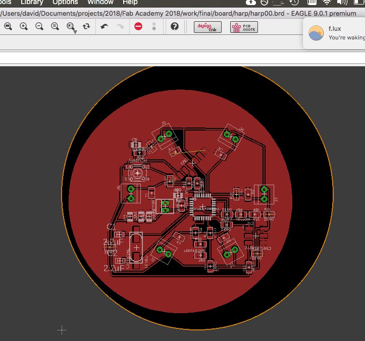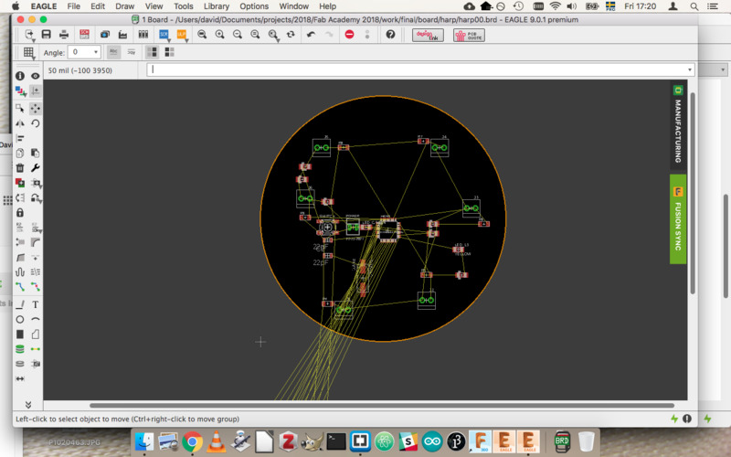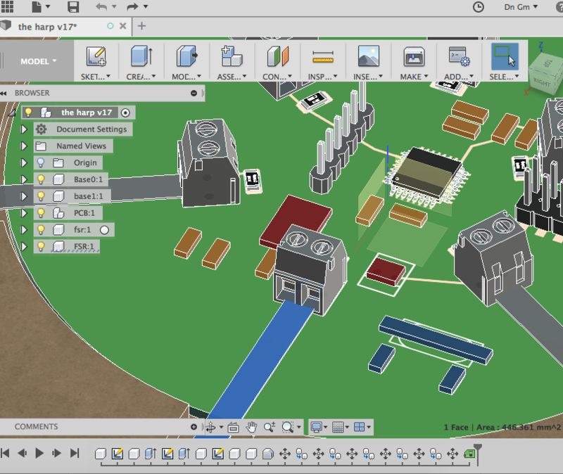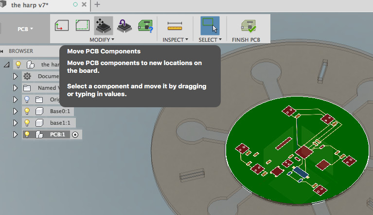 The physical form is functional, but could benefit from an aesthetic reconsideration. The general form is boxy and without an evocative sense. Is a ring really the best construction? Consider something like the Kora, with the strings arranged in a V. I would also like to consider adornment in aspects such as engraving on the wood, and patterns in the PCB. The PCB should also be more visually balanced in its component placement.