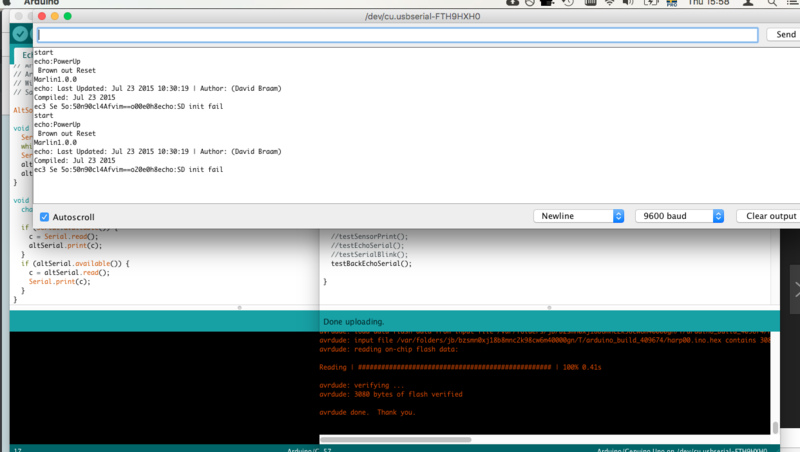 Everything works. Except… The Harp has no flow control, and so will occasionally flood the printer's buffer and cause it to move erractically, this requires patience and a reset.