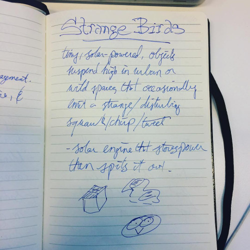 Small objects suspended high in either natural or urban environments. They contain a solar engine and a speaker. When the engine has collected enough energy, the Strange Bird emits a very strange, not-quite birdlike squawk. I often find myself looking straight ahead or down, and am always amazed at the world above me. This objects are intended to get passers-by to look up. The solar engine needs testing to make sure that the timing of the squawks is not too rapid.