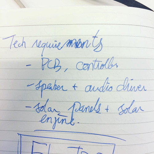The form is uncertain. It could be natural-looking (a bird, a branch), or artificial, such as a plain cube. It would be cut or casted. The electronics require a solar engine, microcontroller, and audio driver and speaker.
