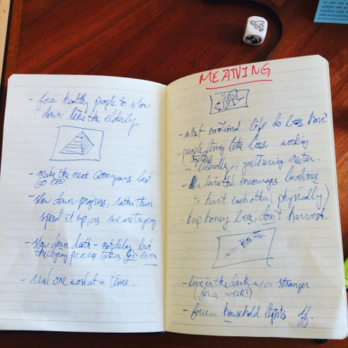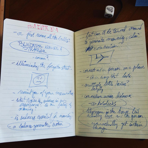 I played a game using Rory's Story Cubes, a tool for creating stories. There are nine dice, each face has an image. For each theme, I rolled one die, and then generated five proposals from the combinations. I did this five times for each of the four themes, generating around 100 possible project proposals. As I went, I circled ideas that I liked. The first exercise used two dice, but I quickly modified the exercise to use one die.