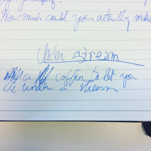 A transparent coffin intended to be placed at the bottom of a stream or river, allowing a person to spend time in that environment.