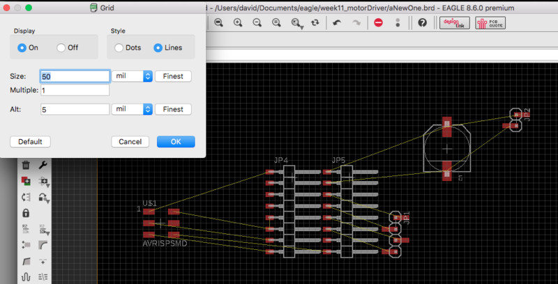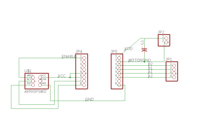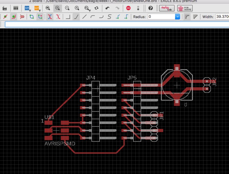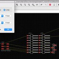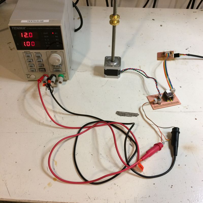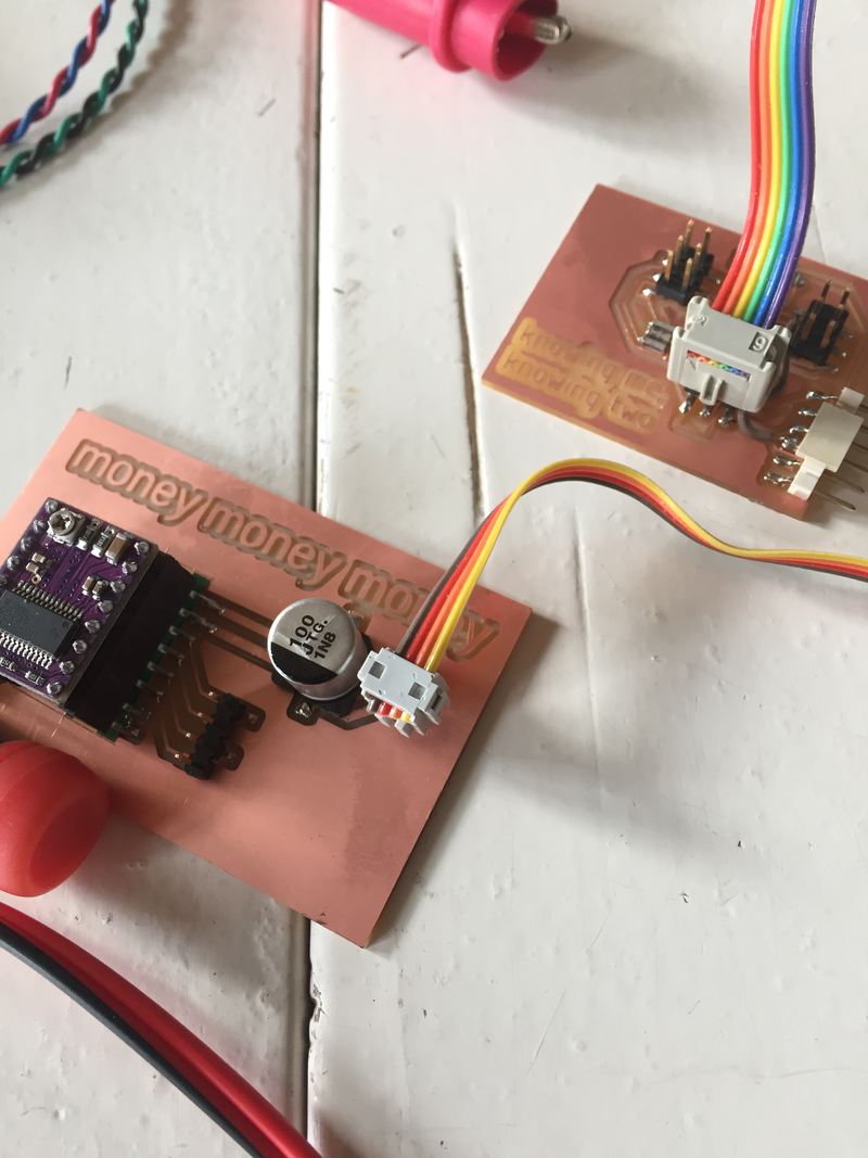 When trying to use this board for the machine design week I examined the schematic and board, and for some reason the FTDI RX pin is not connected in the schematic, even though it is connected in the schematic. So, wtf, Eagle? There are also some other connection weirdnesses. This is not so important, except that I wanted to do some debugging through the serial and now I can't read the serial. Also, the motor driver is using the 0 pin on the Arduino for some control, and that's also needed for the FTDI serial communication. So… that was an oversight, n'est-çe pas? Consider using the existing ISP header for the motor… or, you know, anything else.