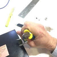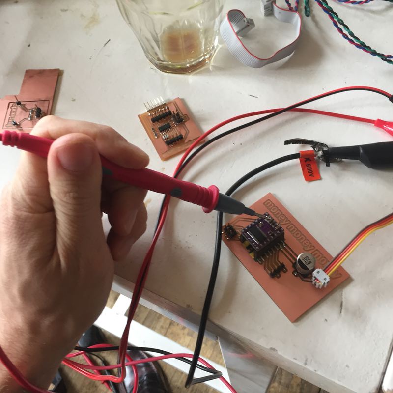 The next big problem was strange behaviour when trying to set the VREF on the motor controller. The youtube instructions didn't have 5V VCC connected, but Emma insisted that it was supposed to be connected. The next problem was that I thought I could use pins from the ATTiny to provide VCC to the motor board. Apparently not. The ATTiny can't provide the amount of current that might be required through its pins. I solved the problem by using jumper wires to connect everything. I think I will redesign the ATTiny board to have, by default, a VCC and a GND pin on each connector, making it easier to power connected boards, or else I set up pairs of pins that can get VCC and GND daisy-chained between boards. Here is me testing the VREF, what was in the cup?: