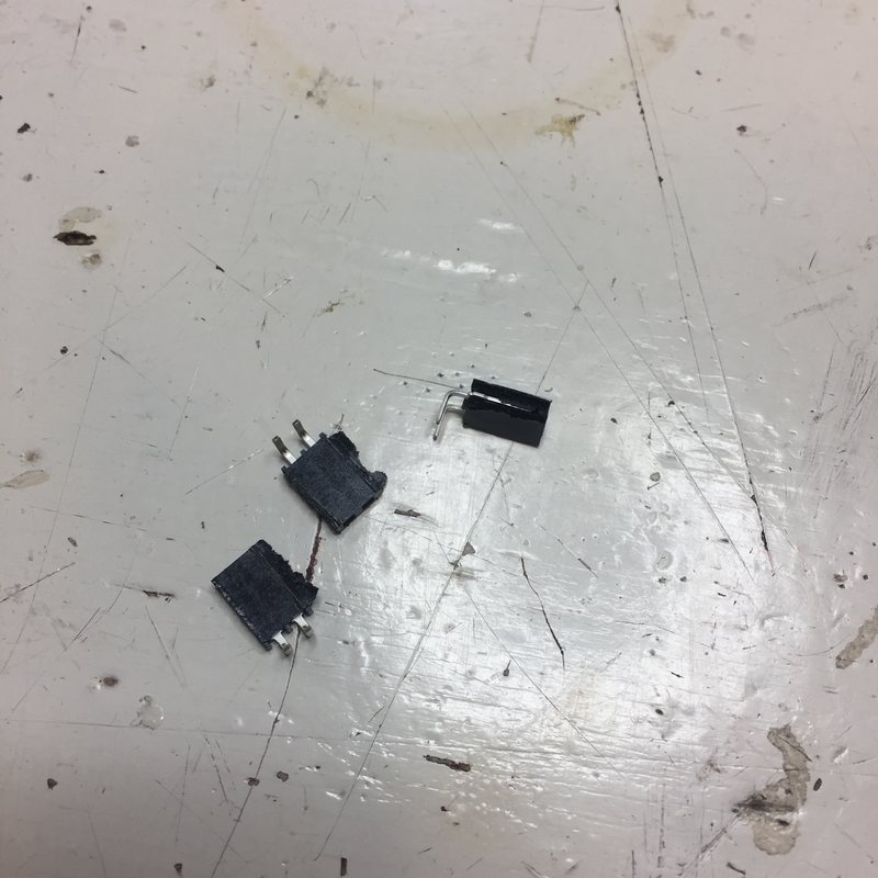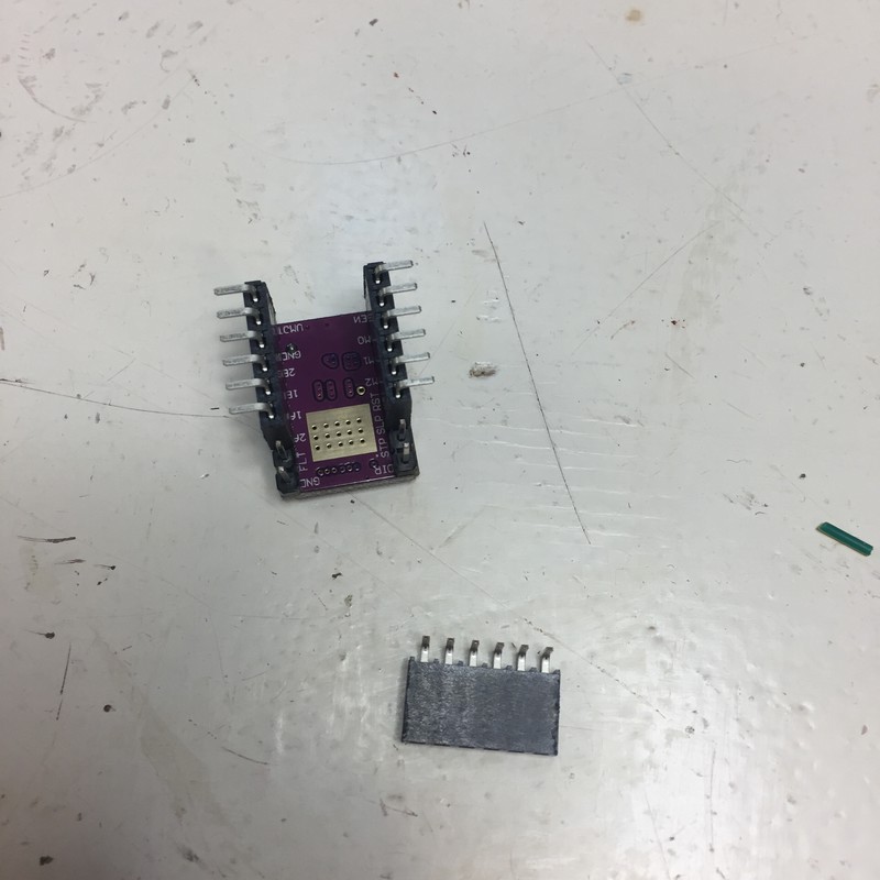I found female headers in which to place the motor driver carrier. There were not enough pins for the driver, so following Emma's advice I split one by scoring it with a knife, splitting it with pliers, and filed down the edges to get them to sit snuggly beside each other.