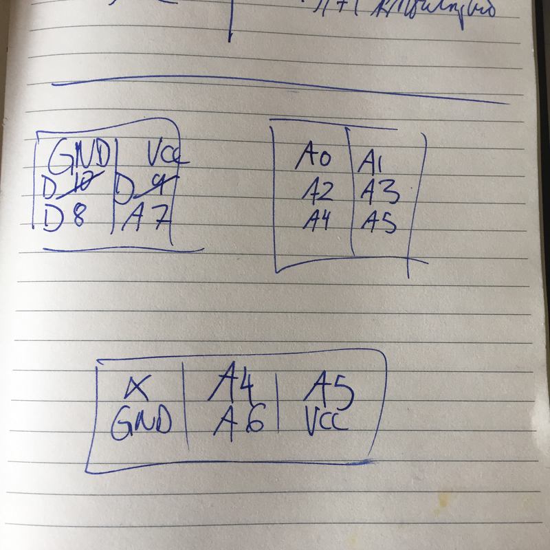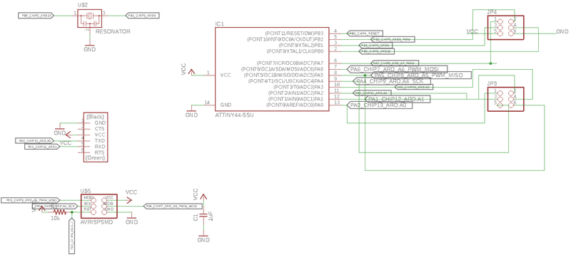 I had a look at the ATtiny Arduino pinout from highlowtech, because I got the idea from Johanna to just use the programmer header as an interface with the other board (because I was too lazy to figure out a cable solution for my straight headers) and found that I had access to Arduino pins 4,5,6, and the rest was GND and VCC and RESET.And, uh oh, I used the reset pin rather than the other available pin, the MOSI pin. Was this going to be a problem? I checked the highlowtech schematic and yes, it was going to be problem. Solution: cut the trace, solder cable to the MOSI pin. Or… I make a cable from the 6-pin programmer header to a flat connector on the attiny board. At least that way I can keep the programmer plugged in when I'm debugging. When considering connectos available here, I think maybe I should have used DIL headers rather than SIL, since that's what all of our connectors are for ribbon cable. Ugh. You know what, I'm going to redesign the ATTINY board. Fudge it.